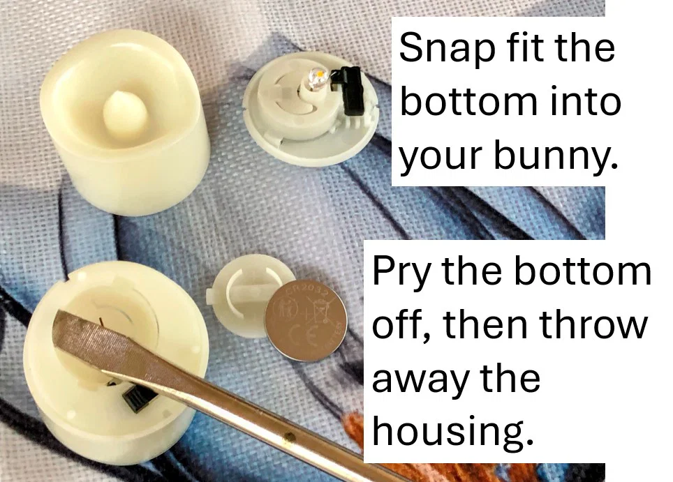 Bạn hãy cậy phần đế của đèn tea light ra khỏi vỏ rồi ấn khớp nó vào đáy của chú thỏ. Mình đã dùng một chiếc tuốc nơ vít dẹt để cậy phần đế ra.