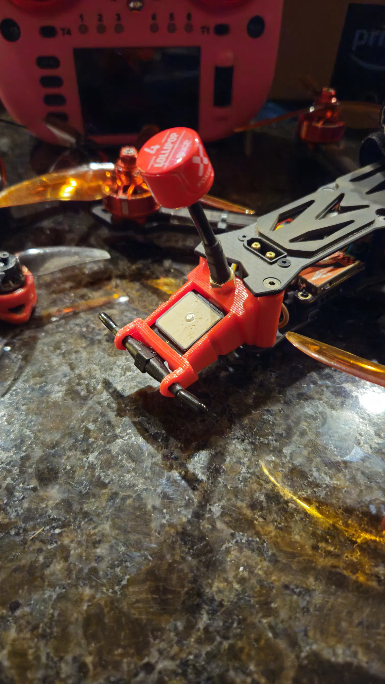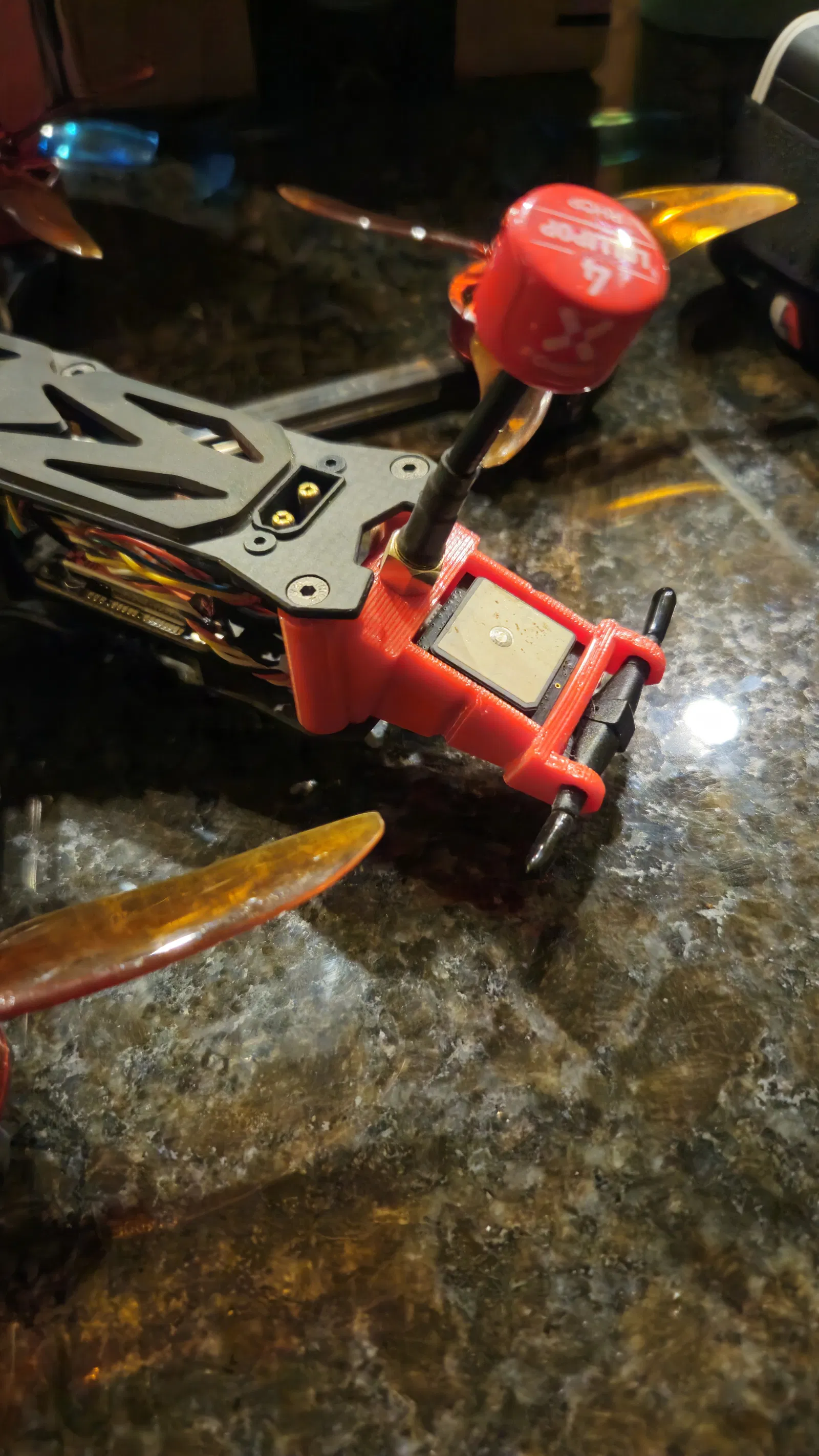 Ăng-ten SMA được đặt ở góc nghiêng về phía sau để tránh cánh quạt một cách tối ưu, và phần vỏ GPS đặt module ở vị trí cao giúp thu tín hiệu vệ tinh tốt. Khay GPS có thêm một khe nhỏ để luồn dây rút, giúp cố định module chắc chắn khi anh em bay lượn mạnh hoặc lỡ xảy ra va chạm.