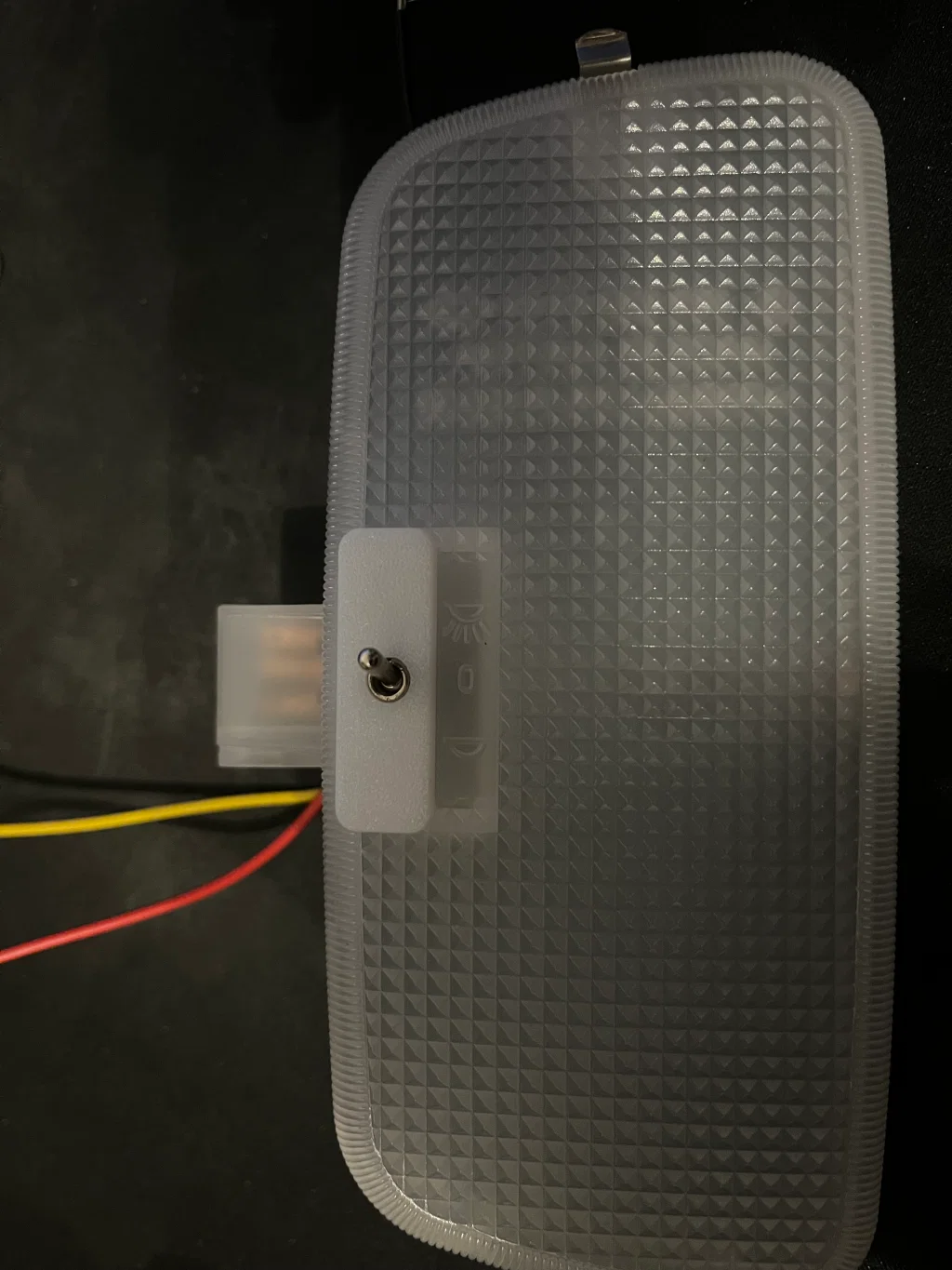 Bộ sửa chữa đèn trần Mercedes Vito 9018200101. Một phần của đèn trần bị gãy khiến công tắc không còn sử dụng được để bật đèn nội thất nữa. Bạn sẽ cần chuẩn bị thêm những linh kiện sau: Công tắc gạt ON-OFF-ON; kích thước 13mm x 8mm Long đền 9mm. Công tắc gạt này được thiết kế để không cần vặn ốc cố định mà chỉ giữ bằng lực ma sát. Trong trường hợp xảy ra tai nạn, công tắc có thể bung ra hướng lên trên để đảm bảo an toàn. Phần lỗ khoét cho đai ốc được thiết kế để bạn có thể điều chỉnh độ cao nếu cần, đồng thời cũng giúp tăng độ ma sát. Cá nhân mình cuối cùng đã quyết định không dùng đến đai ốc đó.