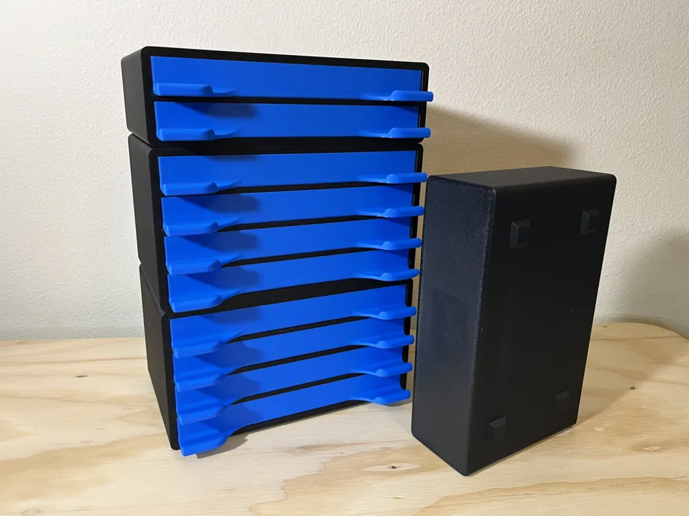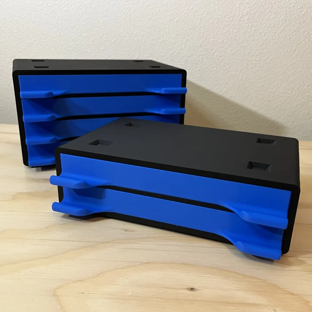 Hệ thống lưu trữ linh kiện điện tử in 3D dạng mô-đun, cho phép xếp chồng các hộp và tùy chỉnh khay kéo, giúp bạn sắp xếp gọn gàng mọi linh kiện trên bàn làm việc một cách khoa học.