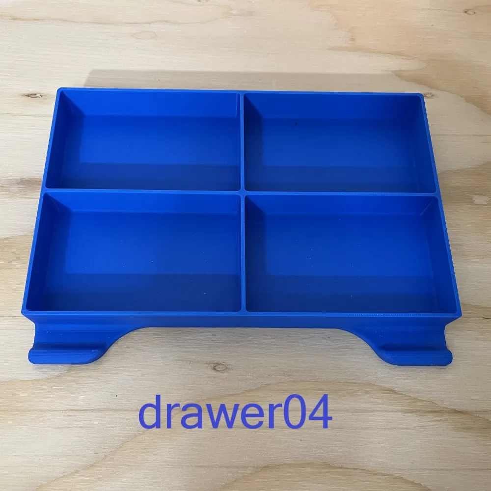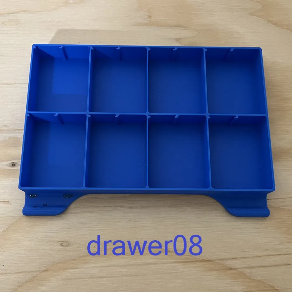 Mỗi chiếc hộp đều rất chắc chắn và có thể xếp chồng lên nhau, với chân đế tích hợp khớp chặt vào mặt trên của hộp khác để đảm bảo sự ổn định. Các khay kéo có khe gắn nhãn vừa vặn với thẻ 25 mm × 22 mm, giúp việc phân loại linh kiện trở nên cực kỳ dễ dàng.