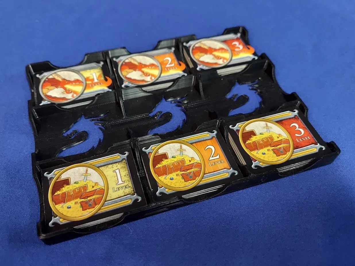 Bạn sẽ cần hai khay này, và tùy chọn nắp, để giữ các thẻ gặp gỡ và thẻ kho báu cho sáu cấp độ ngục tối. Mỗi cấp độ được thiết kế để chiếm một cột duy nhất với hai vị trí “rồng” ở trên cùng cho các chồng thẻ quái vật và thẻ loại bỏ và vị trí “hòm” ở dưới cùng giữ các thẻ kho báu của cấp độ đó.