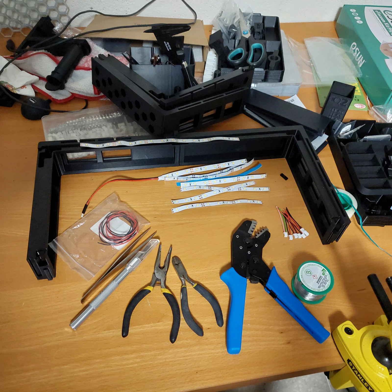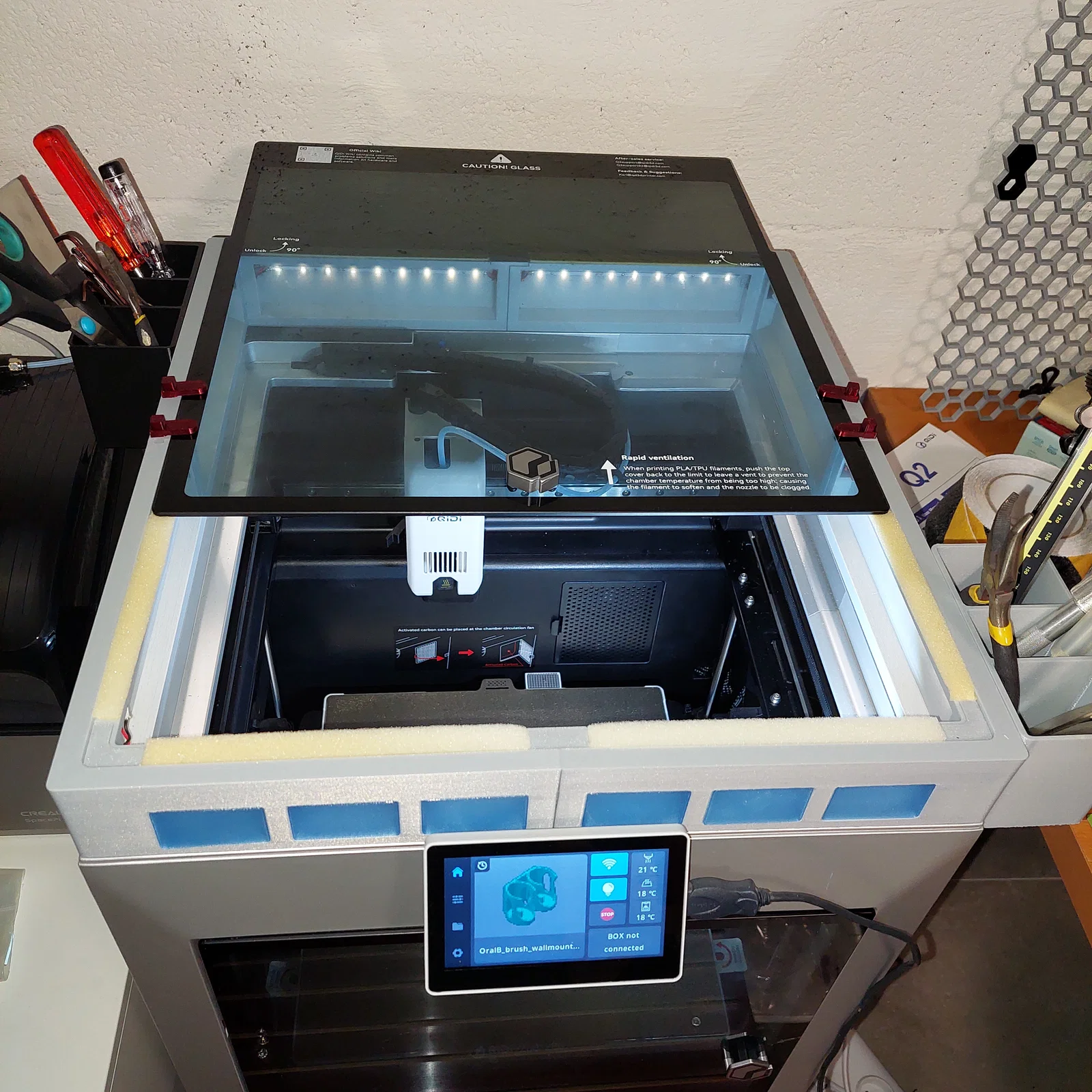 Thiết kế này ban đầu được đăng tải trên Thingiverse. Cập nhật ngày 19/01/2026: Đã thêm thiết kế hộp thay thế. Được thiết kế để sử dụng kết hợp với https://www.thingiverse.com/thing:7273534. Mình cần một bộ riser cho máy in QIDI Q2 nhưng không có thiết kế nào sẵn có đáp ứng được nhu cầu, nên mình đã tự làm một cái. Ban đầu, mình reverse engineer thiết kế công khai từ website của QIDI để lấy cơ sở (file CAD chuẩn) làm việc (lúc đó mình còn chưa có máy). Mình cũng học hỏi ý tưởng từ các thiết kế khác như thêm đèn LED và phụ kiện tường Honeycomb. Vì mình không đặt hộp nhựa trên máy in nên có thể dễ dàng mở/tháo nắp kính, do đó mình không làm khe thông gió ở cạnh bên. Mục tiêu thiết kế chính của mình là: Nâng nắp thêm 80mm (sau đó giảm còn 50mm vì in quá lâu). Tăng cường và tỏa đều ánh sáng lên bàn in. Nếu được, đồng bộ đèn LED bổ sung với LED có sẵn của máy. Linh hoạt sắp xếp các công cụ và vật liệu hay dùng ở cạnh máy. Mình đã cải tiến thiết kế clip vì nghe nói chúng khá mỏng manh. Trong thiết kế của mình, clip dài và dày hơn, đồng thời thêm một chốt khóa để cố định clip. Có hai lỗ gắn clip ở mỗi bên để bạn tùy chọn. Mình cũng gặp vấn đề cong vênh khi in ASA và ABS, nên đã thêm các hình nón nhỏ để hỗ trợ, chúng rất dễ tháo rời. Mình giữ các khe thông gió ở mặt trước nhưng che lại bằng nhựa PETG trong suốt để thẩm mỹ và hạn chế thất thoát nhiệt. Về đèn LED, mình chọn loại 8mm, 60 LED/mét, 12V. Mình dùng 8 dải, mỗi dải 15cm (9 LED) kết nối bằng đầu nối JST PH. Tổng dòng điện khoảng 1A. Ý tưởng là dán các dải LED vào 4 phần đế, luồn dây qua các khoang dẫn và đậy nắp lại. Hãy xem PDF đính kèm để biết danh sách linh kiện (BoM) và hình ảnh lắp ráp. Mình cũng tích hợp giao diện Honeycomb để gắn thêm các khay, hộp hoặc móc treo tùy ý. Mình có đính kèm file STEP để các bạn dễ dàng chỉnh sửa. Về phần tự động hóa, mình dùng ổ cắm thông minh kết hợp với HomeAssistant để đồng bộ đèn LED ngoài với đèn LED tích hợp của máy in thông qua tích hợp Moonraker. Dù phản hồi hơi chậm (khoảng 30 giây) nhưng hoạt động rất ổn. Thông số in: Máy in: QIDI Q2. Chất liệu: Azurefilm ASA Silver. Infill: 25%. Hỗ trợ: Có. Nhiệt độ bàn: 100°C. Nhiệt độ buồng: 55°C.
