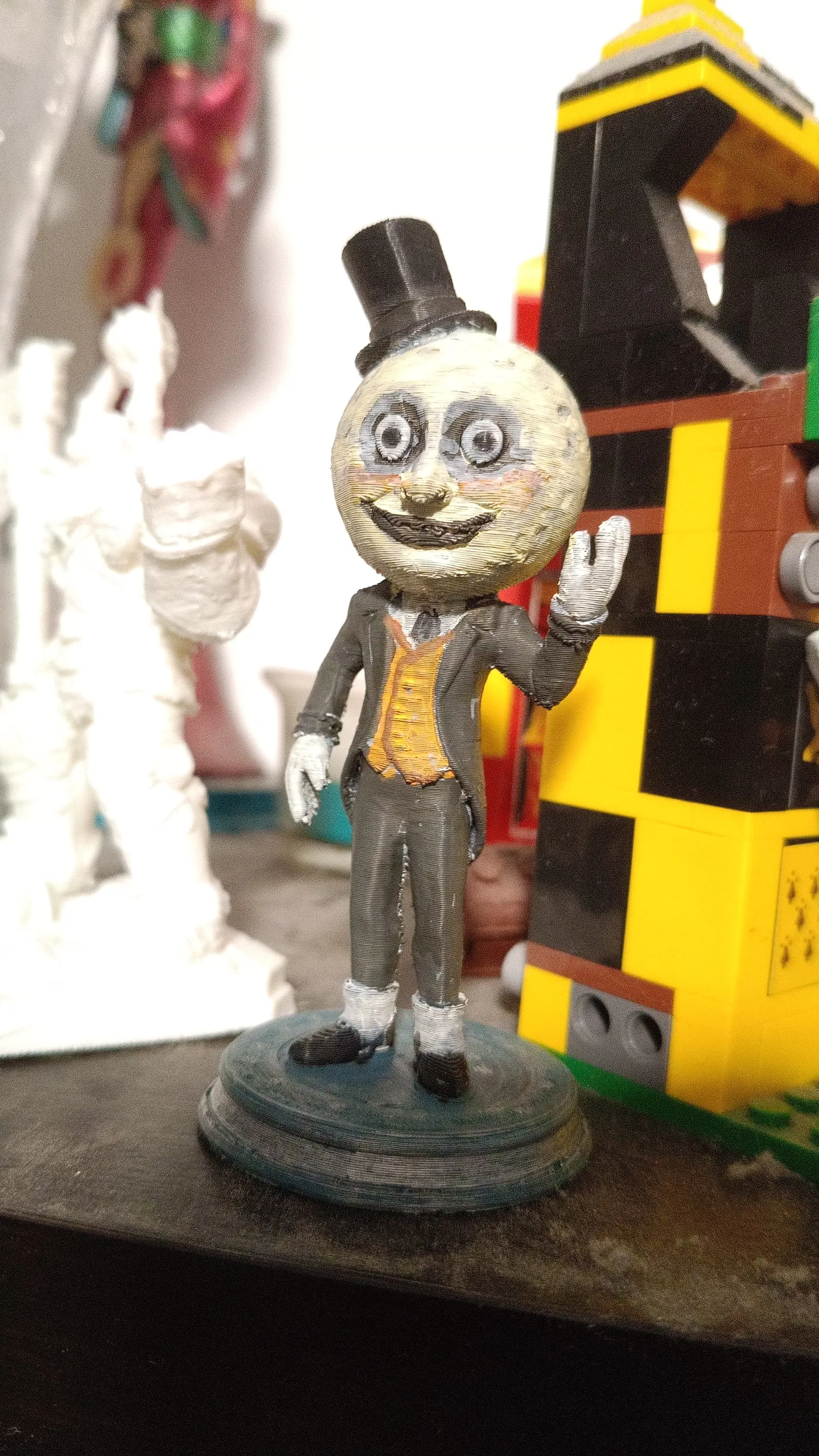 Một quý ông lịch lãm diện vest và đội mũ chóp cao với gương mặt là một vầng trăng. Một tác phẩm cực kỳ thú vị và độc đáo, chắc chắn sẽ khiến bạn mỉm cười mỗi khi ngắm nhìn. Thích hợp để in bằng nhựa PLA và tô vẽ theo ý thích.