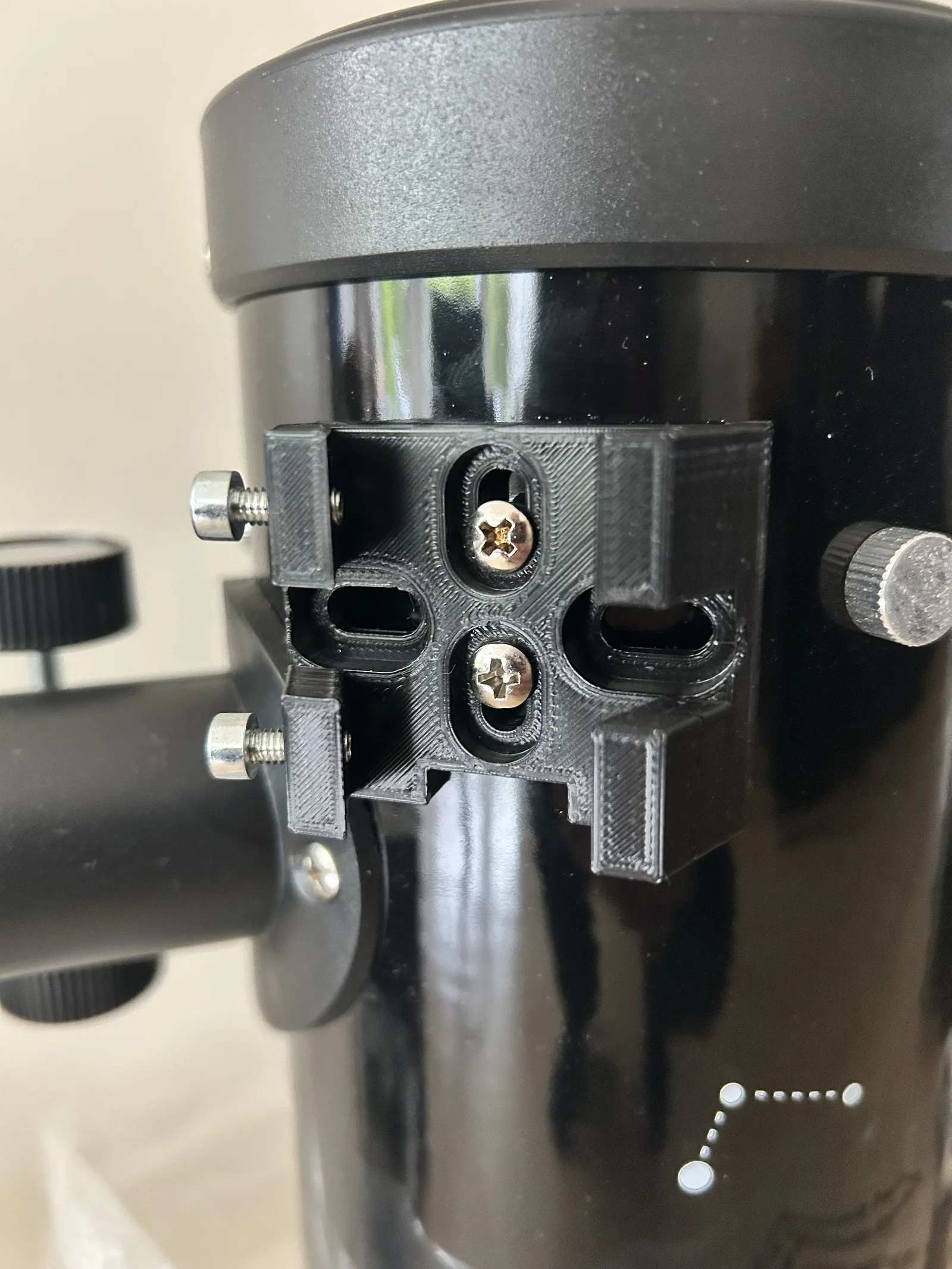 Mình đã bổ sung thêm hai khe cắm để có thể lắp đế này vừa vặn với kính thiên văn NatGeo 76/700 Newton (Bresser). Giống như bản gốc, sản phẩm này có sẵn hai lỗ ren để bắt vít M4x10 giúp cố định ống ngắm (finder scope) thật chắc chắn.