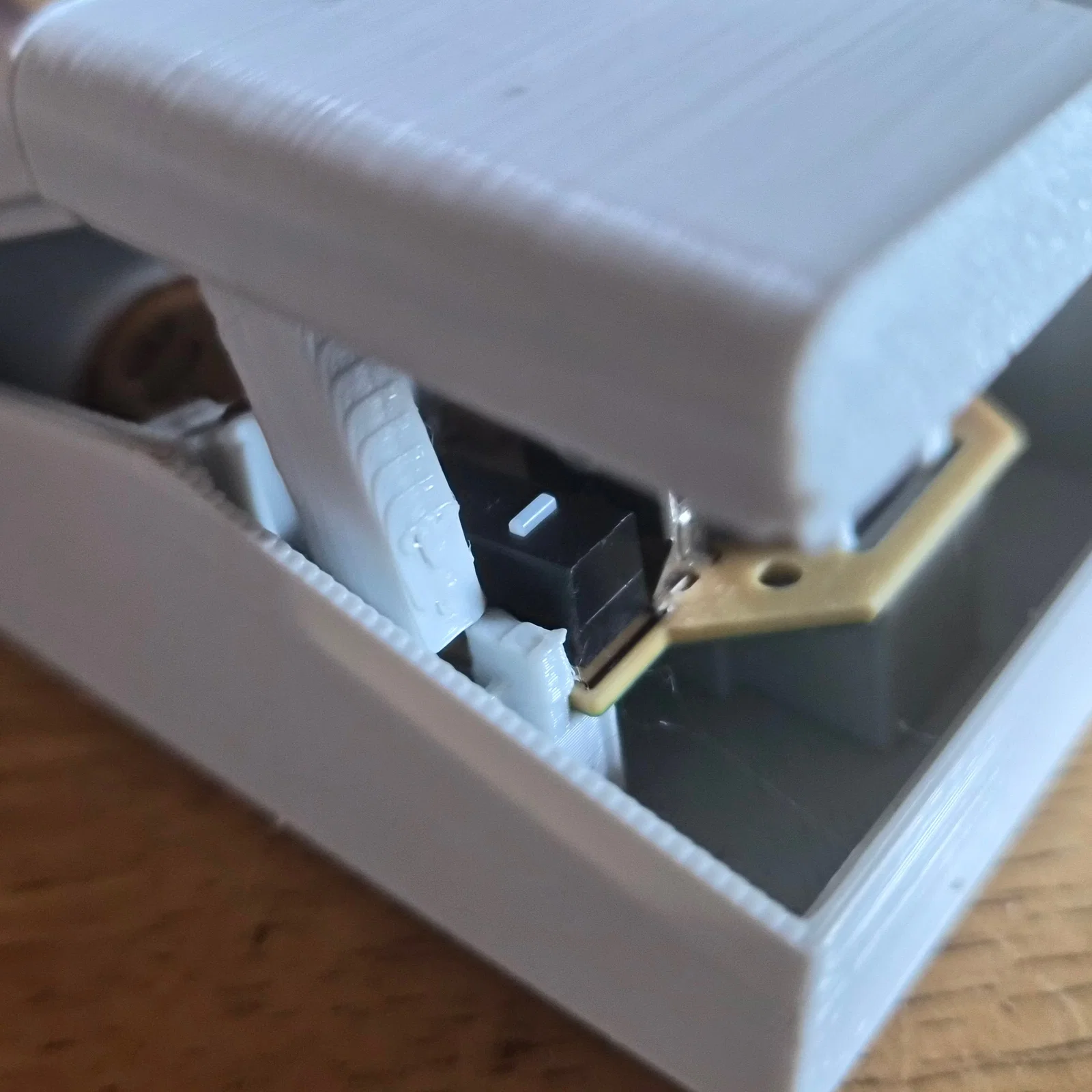 LỜI KHUYÊN: Để các nút bấm hoạt động chính xác, chúng cần được đặt đúng vị trí và cách tiếp điểm microswitch trong vòng 1mm. Nếu bạn không nghe tiếng "tách" khi nhấn nút, có thể là nó đang quá gần. Bạn có thể thêm các vòng đệm mỏng vào bên trong vỏ dưới chân của nắp để nâng nó lên một chút. Ngoài ra, hãy đảm bảo rằng bảng mạch PCB đã được nhấn vào đúng vị trí cả phía trước và phía sau.
