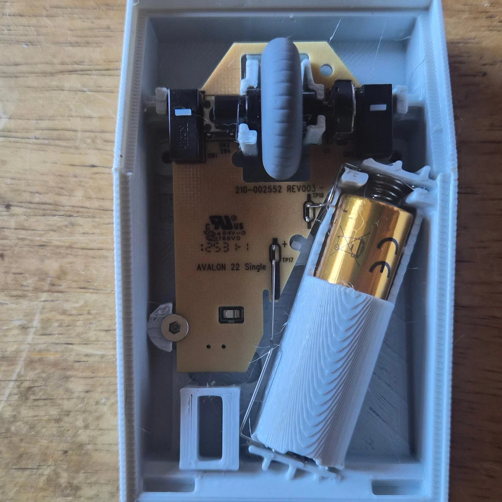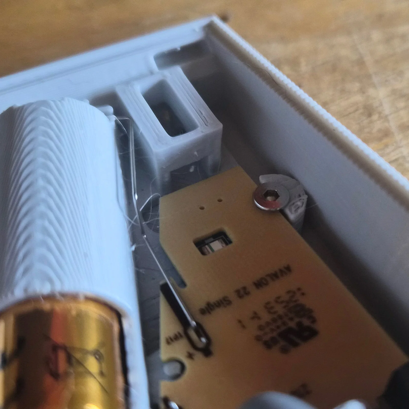 Lắp trục con lăn vào ổ cắm trên bảng mạch PCB rồi cẩn thận nhấn PCB vào phần đế ST. Con lăn sẽ khớp vào các giá đỡ mới, nhưng bạn có thể cần nhấn nhẹ PCB ở phía trước bên trái và bên phải để nó vào đúng vị trí. Bảng mạch PCB sẽ hơi nghiêng lên phía trước thay vì nằm phẳng, nên bạn hãy nhấn PCB xuống ở phía sau và cố định bằng một con ốc vít đầu bằng M3x8 ở phía sau bên trái. Đảm bảo các cực pin nằm đúng vị trí trong hốc chứa pin.