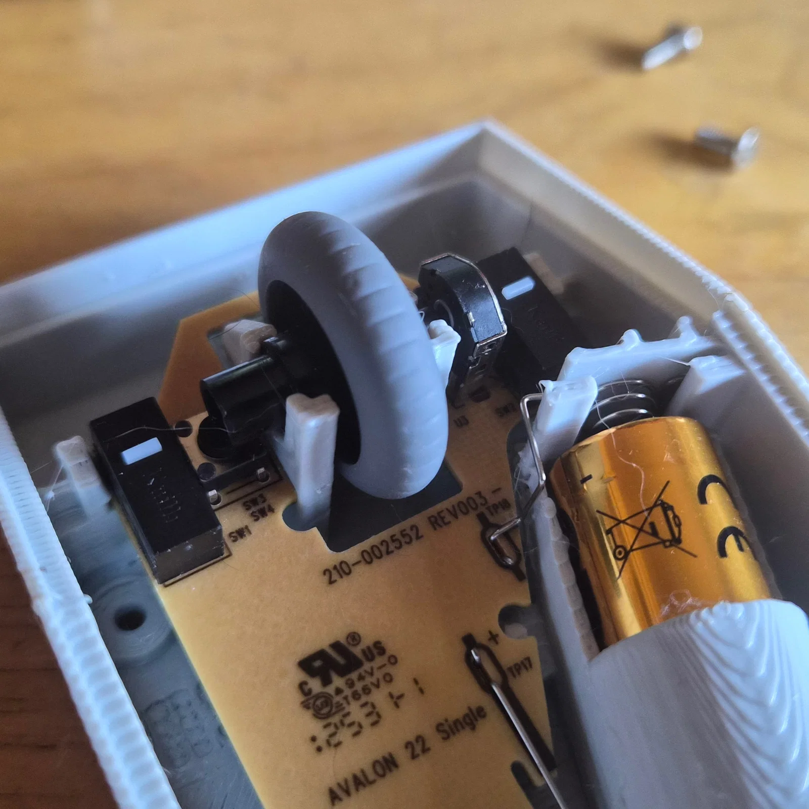 Bạn hãy tháo con ốc duy nhất bên trong ngăn chứa pin của chuột M185 để lấy các linh kiện Logitech ra. Bạn sẽ cần bảng mạch PCB, dây dẫn cho cực pin và cụm con lăn trên trục của nó.
