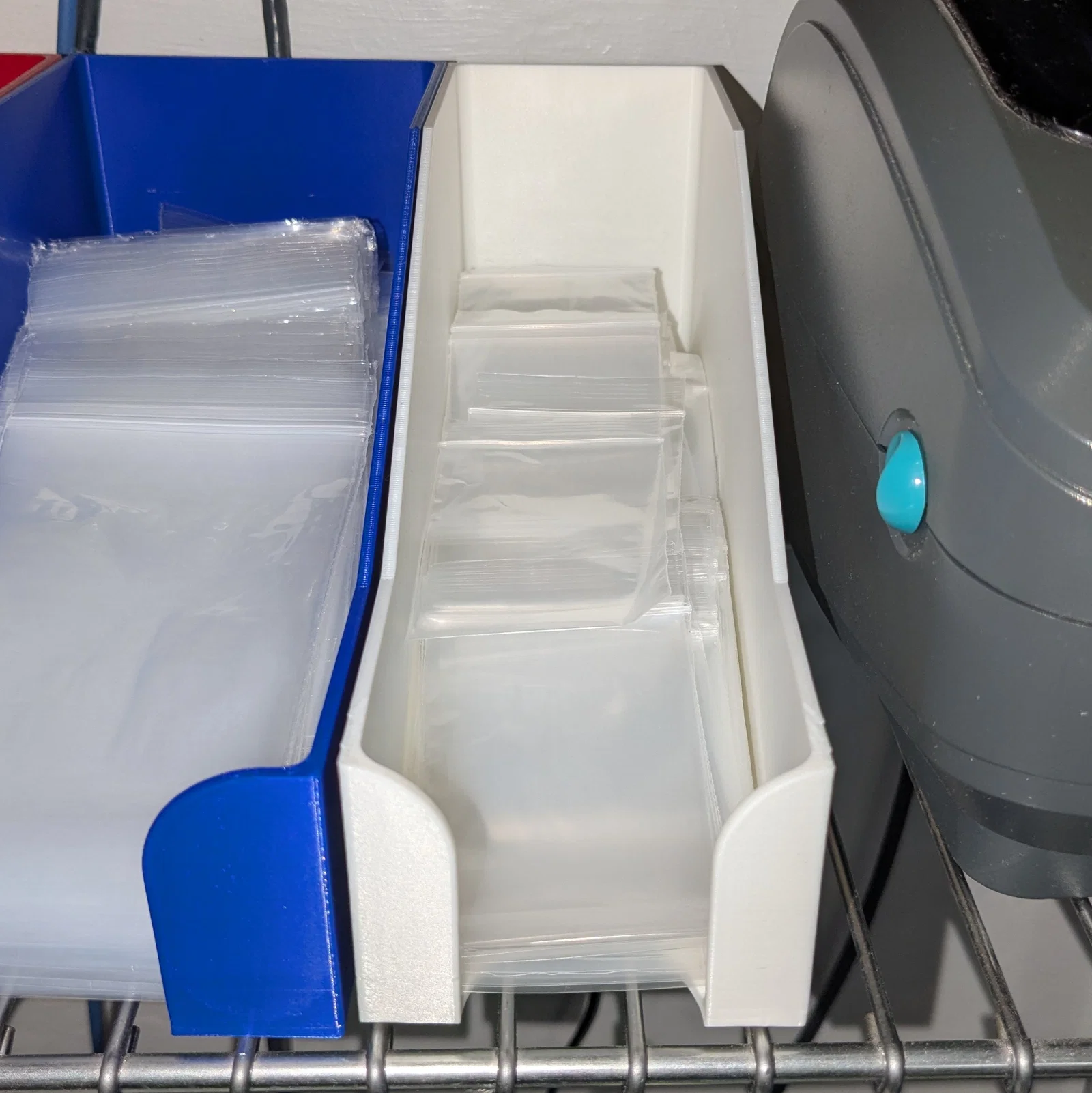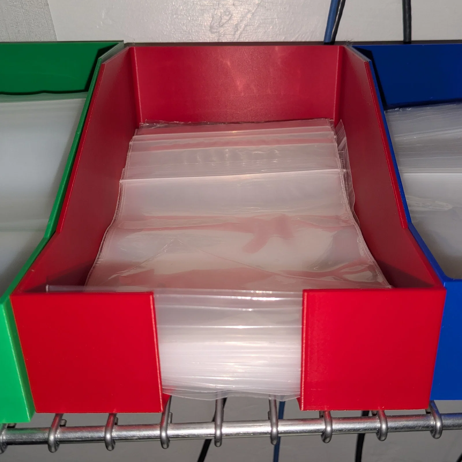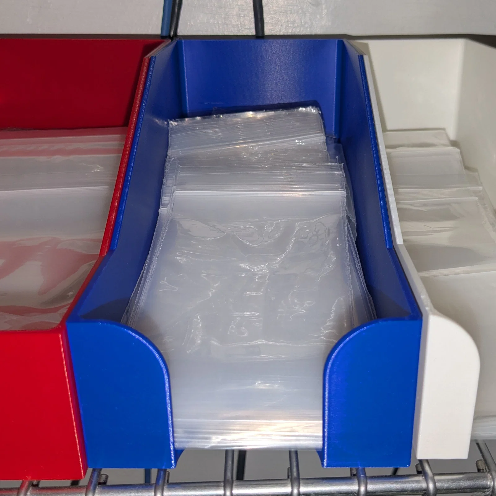 Đây là các khay đựng túi ziplock đơn giản. Được thiết kế cho loại kệ có nửa chiều rộng trên giá đỡ kích thước 48x18 inch. Ở phía sau khay có một khe hở đặc biệt giúp cố định khay tại vị trí mép kệ một cách chắc chắn. Sản phẩm được in bằng nhựa ABS với nhiều màu sắc khác nhau. Thông số in đề xuất: Layer Height 0.2mm.