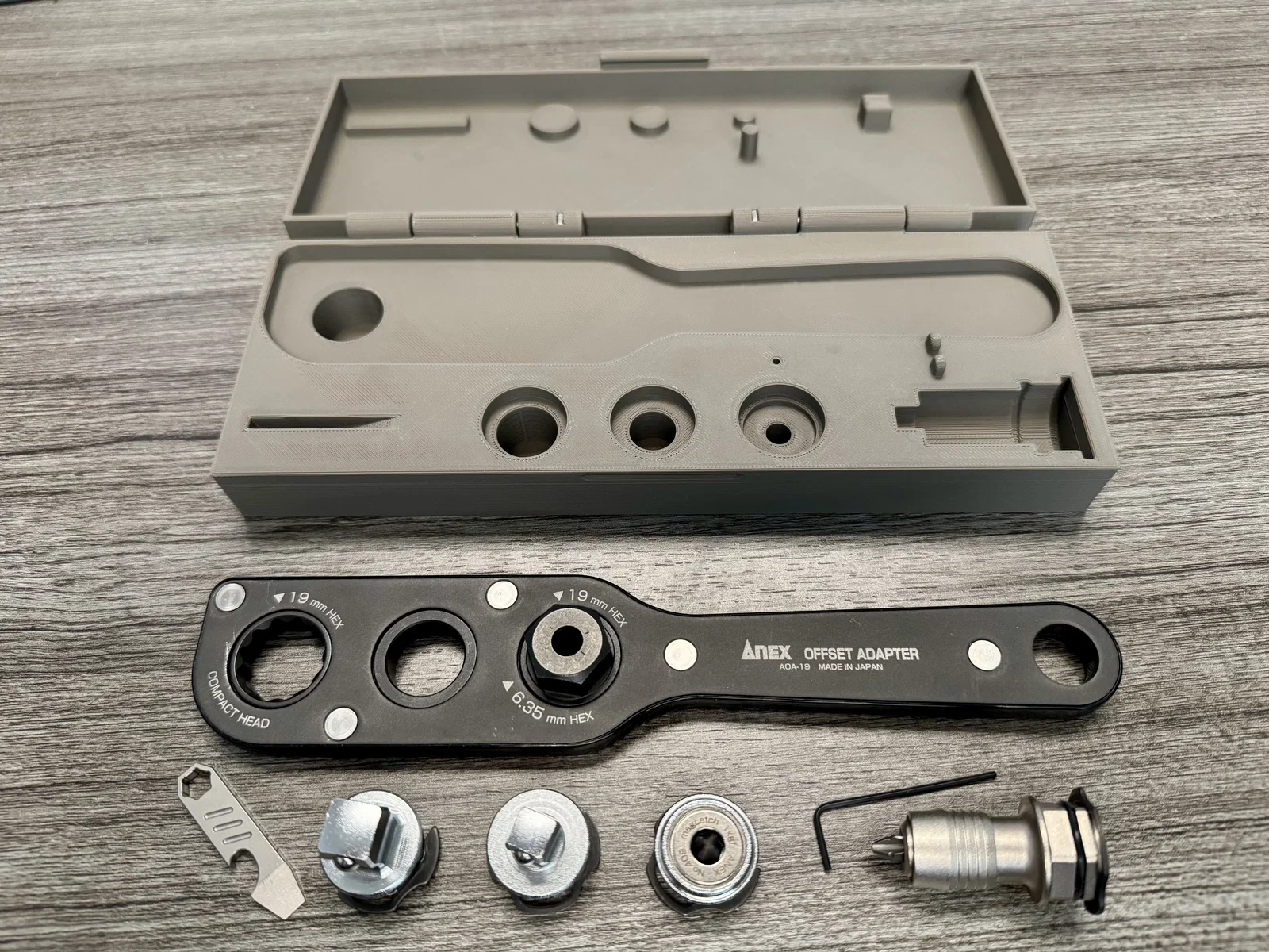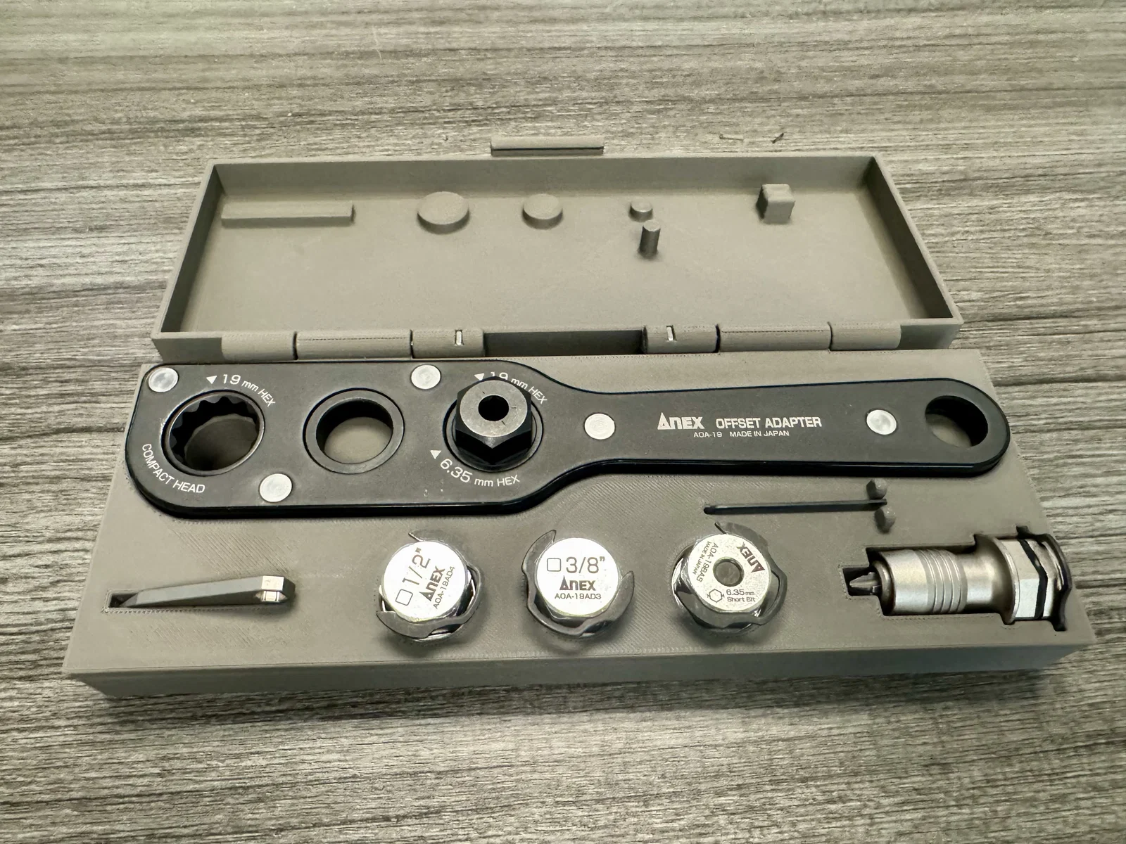 Hộp đựng được thiết kế riêng cho bộ Anex Offset Wrench (AOA-19) cùng các phụ kiện đi kèm như đầu chuyển 1/2, 1/4, các loại adapter bit và một cây nạy nhỏ. Thiết kế thông minh, không cần support khi in.