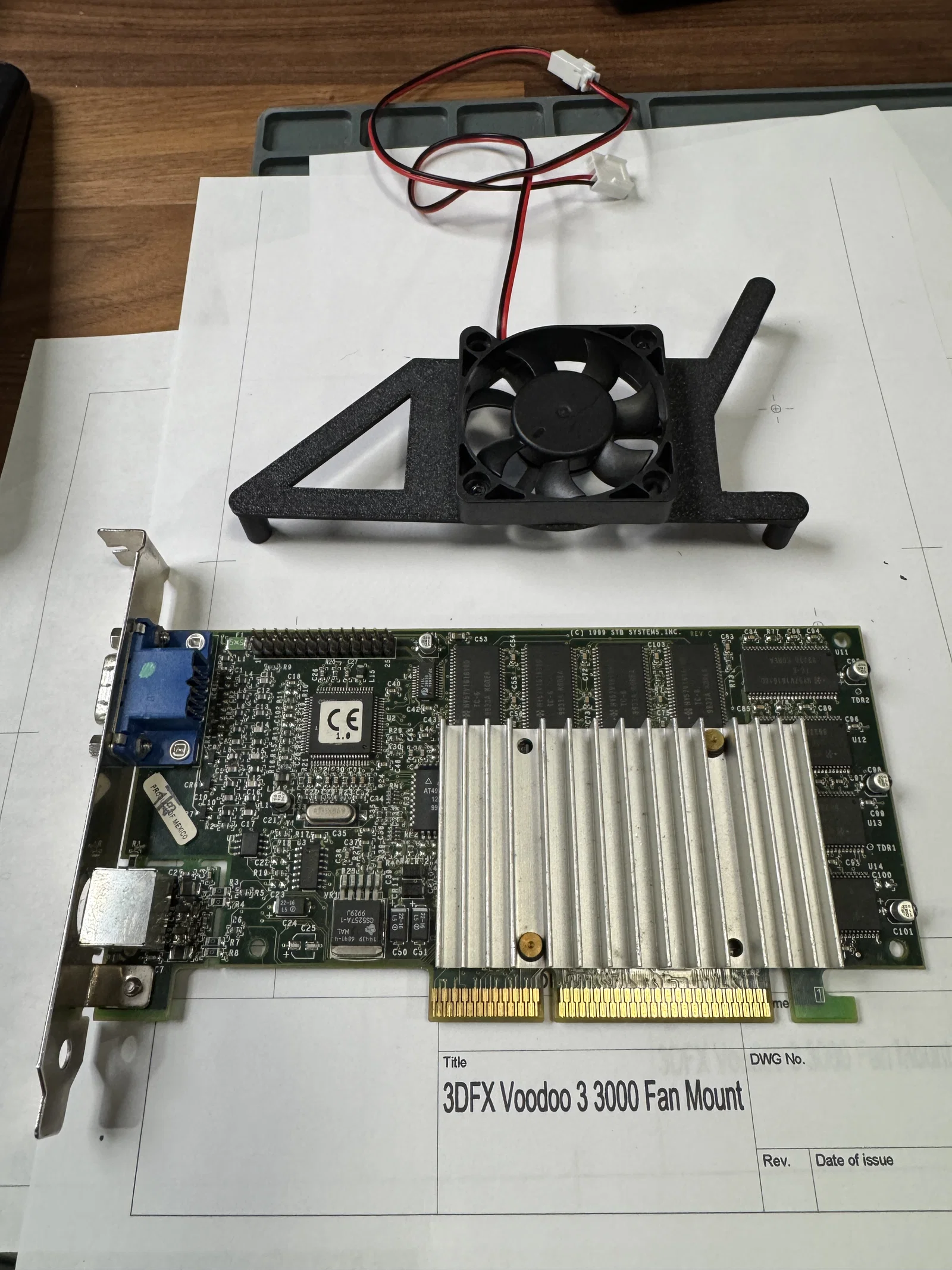 Nhiều người khá lo ngại về vấn đề quá nhiệt trên mấy dòng card đồ họa cổ điển 3DFX Voodoo 3 3000 khi chỉ dùng tản nhiệt thụ động. Mình không ưng ý với các mẫu ngàm gắn quạt hiện có trên thị trường, mà sẵn đang có một chiếc quạt 50mm, nên mình đã tự thiết kế một cái ngàm gắn quạt sử dụng ốc vít để cố định vào 3 lỗ có sẵn trên bảng mạch PCB của card.