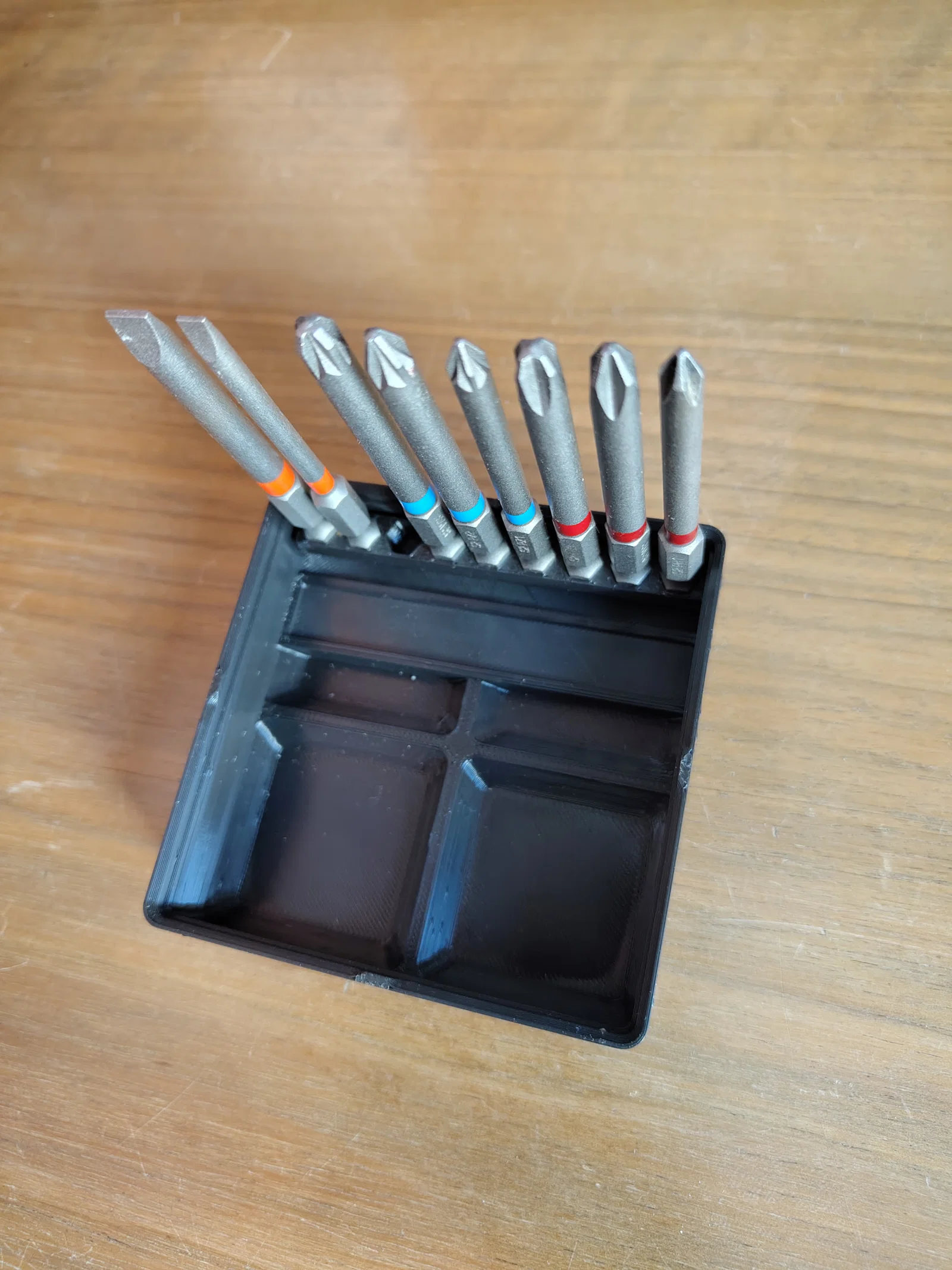 Mẫu thiết kế này được tối ưu hóa để tương thích hoàn hảo với hệ thống kệ Gridfinity, giúp không gian làm việc của anh em trở nên gọn gàng và chuyên nghiệp hơn hẳn. Điểm đặc biệt của nó chính là cơ chế bản lề linh hoạt, cho phép lật phần chứa mũi khoan lên để dễ dàng quan sát và thao tác. Anh em không cần phải bới tung cả hộp đồ nghề lên nữa, mọi thứ đều nằm ngay trước mắt.