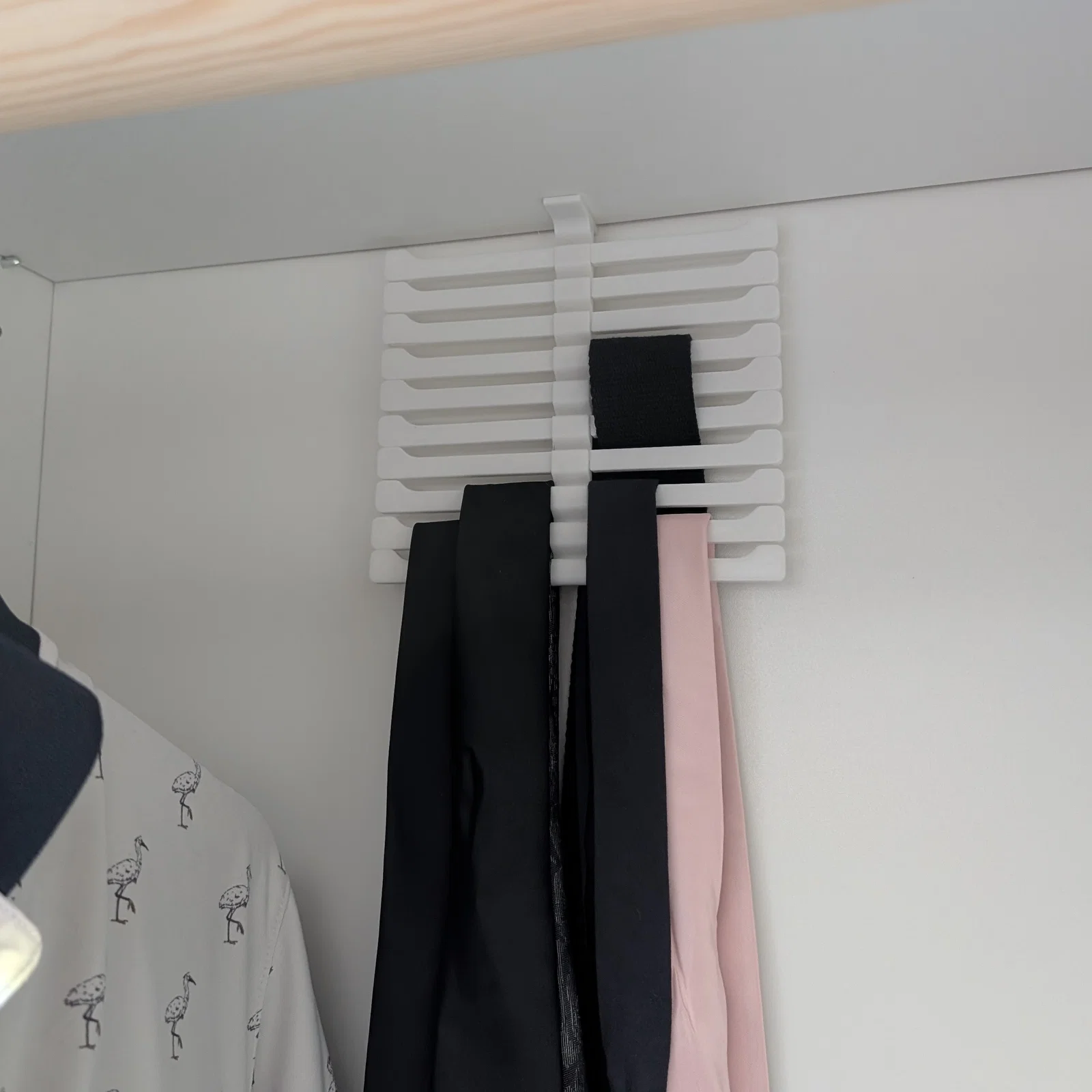 Phụ kiện này giúp treo được ít nhất 20 chiếc cà vạt hoặc thắt lưng vào khoảng trống giữa quần áo treo trên sào và vách tủ phía sau.