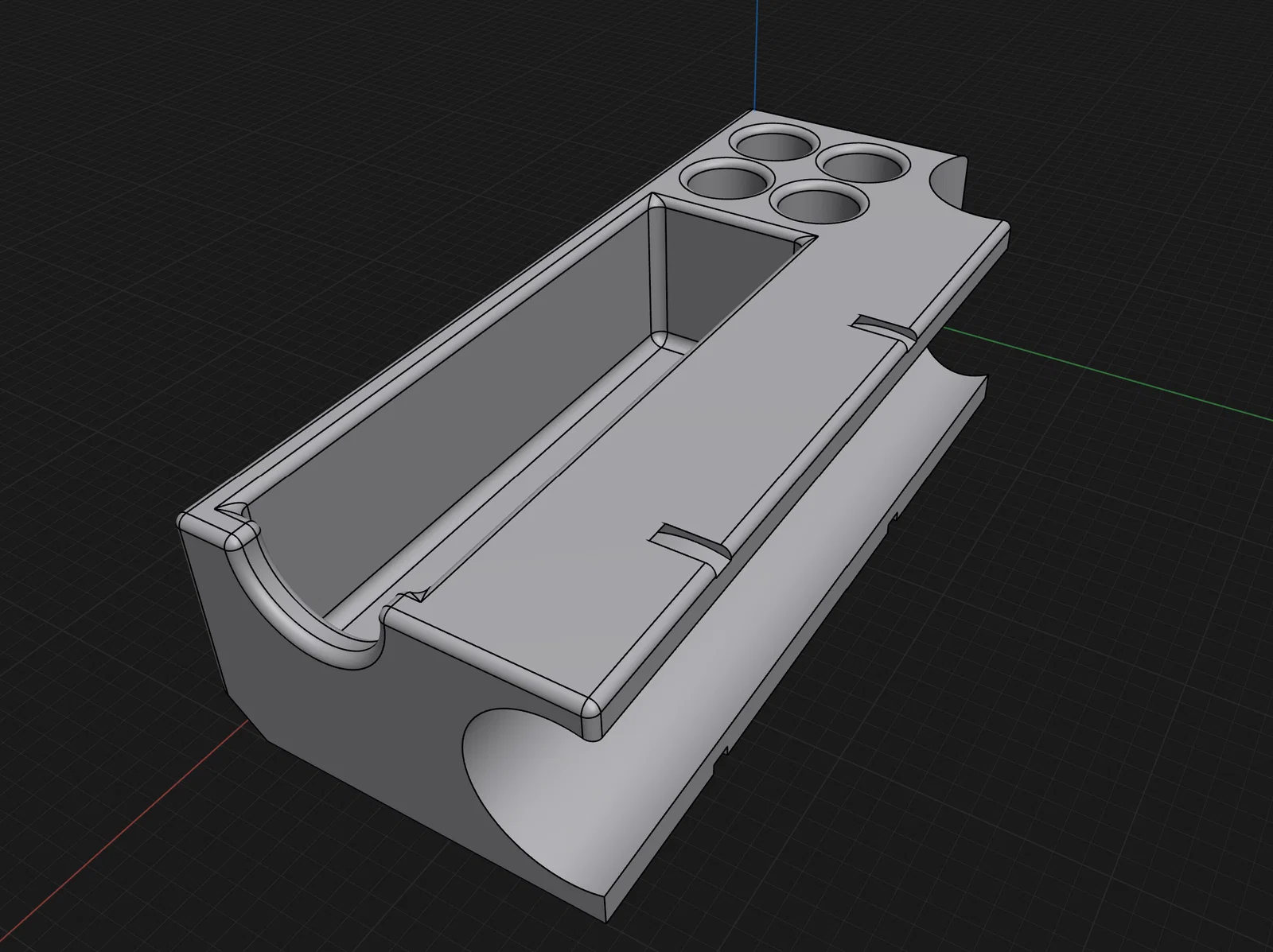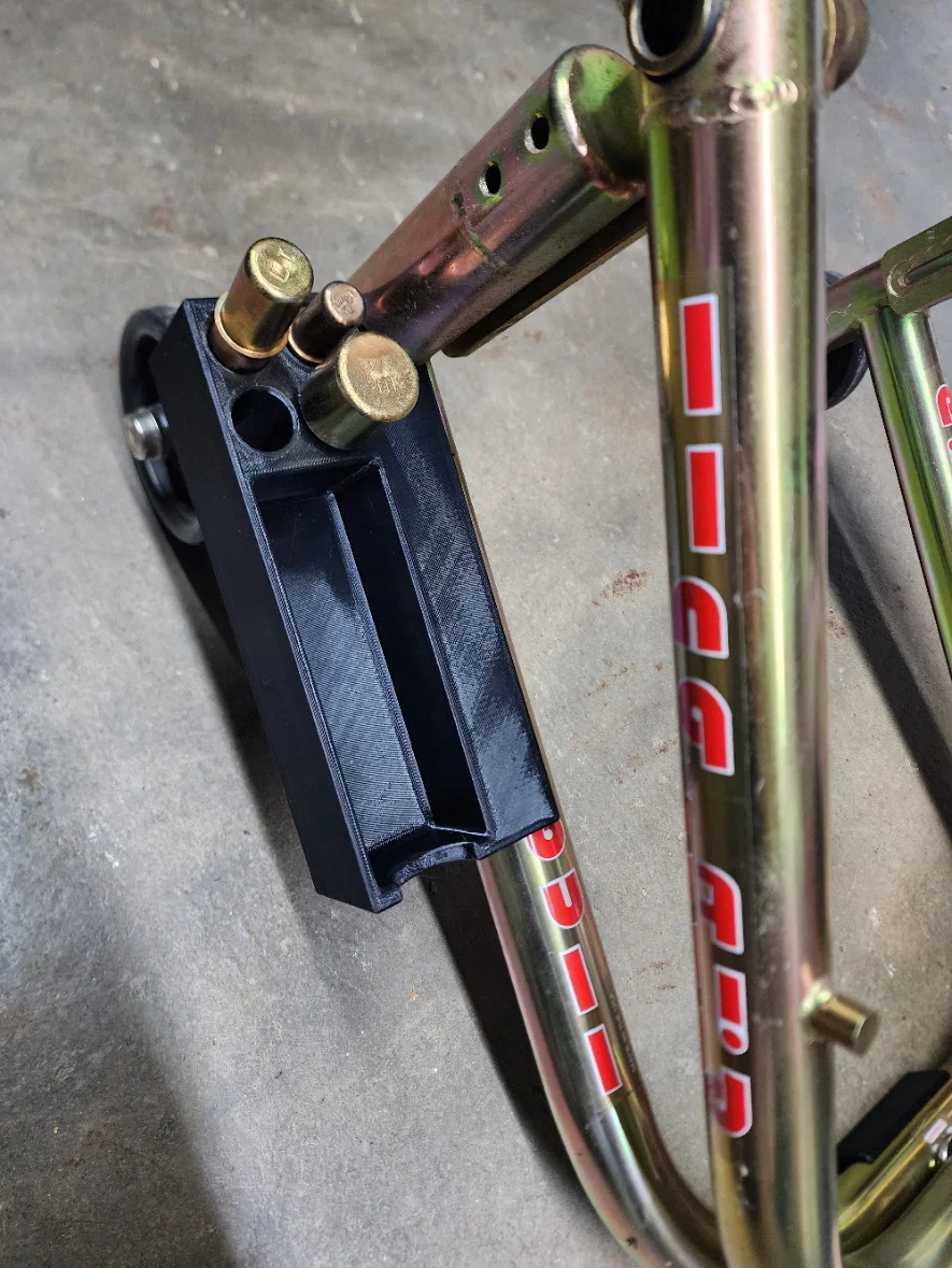 Khay này còn có chỗ để cất các đầu adapter cho giá đỡ xe. Bạn có thể in đối xứng (mirror) để gắn khay cho cả hai bên. Hãy tận dụng các khe xỏ dây rút (zip tie) để cố định khay thật chắc chắn, tránh việc trọng lượng của dụng cụ làm khay bị xoay.