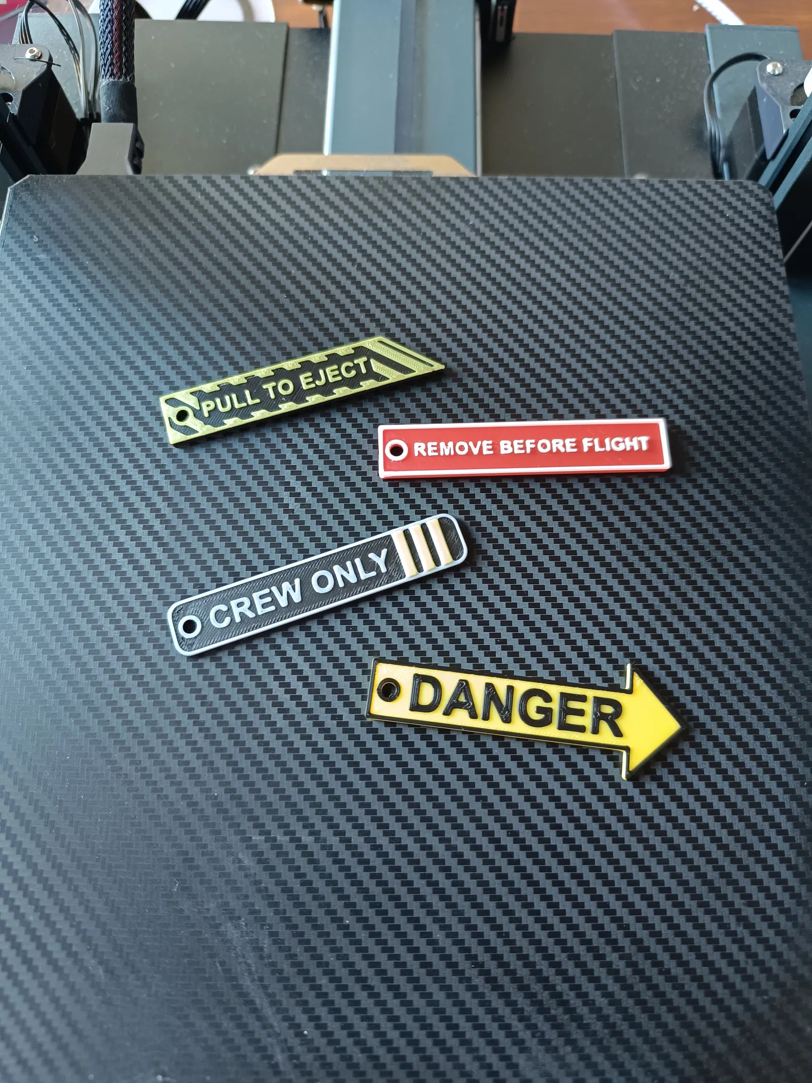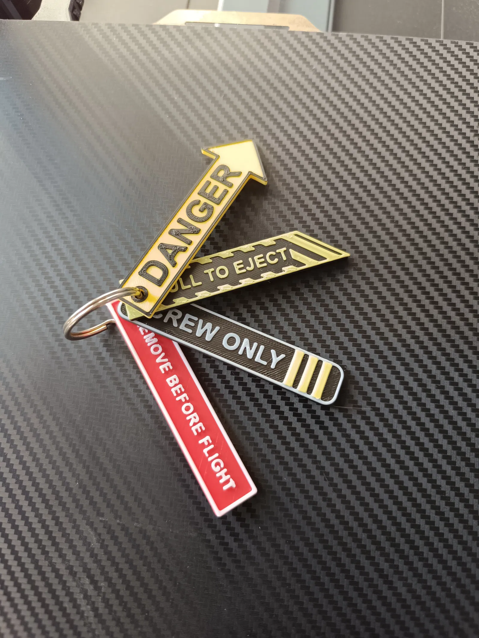 Khám phá bộ sưu tập móc khóa lấy cảm hứng từ chủ đề hàng không đầy sáng tạo, giúp chùm chìa khóa của bạn trở nên độc đáo và cá tính hơn bao giờ hết. Các mẫu móc khóa này mô phỏng chân thực các biển báo cảnh báo an toàn như 'Remove Before Flight' hay 'Pull to Eject', mang đến vẻ ngoài chuyên nghiệp cho những ai đam mê công nghệ và máy bay. Sản phẩm được thiết kế tối ưu cho in 3D FDM với nhựa PLA, dễ dàng thực hiện tại nhà bằng cách thay đổi màu nhựa trong quá trình in. Đây là món phụ kiện trang trí tuyệt vời, thể hiện cá tính riêng và là món quà ý nghĩa dành tặng bạn bè hoặc người thân cùng sở thích. Hãy trổ tài in 3D để sở hữu ngay những chiếc móc khóa cực ngầu này.
