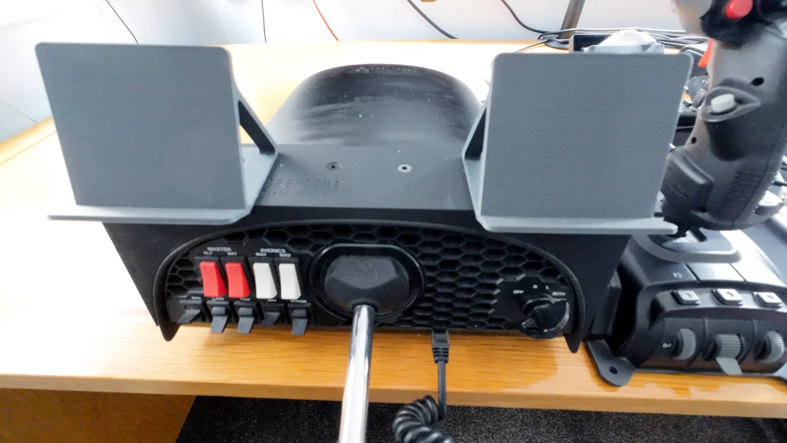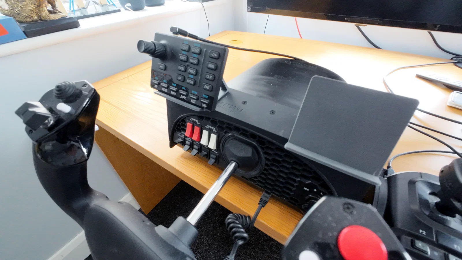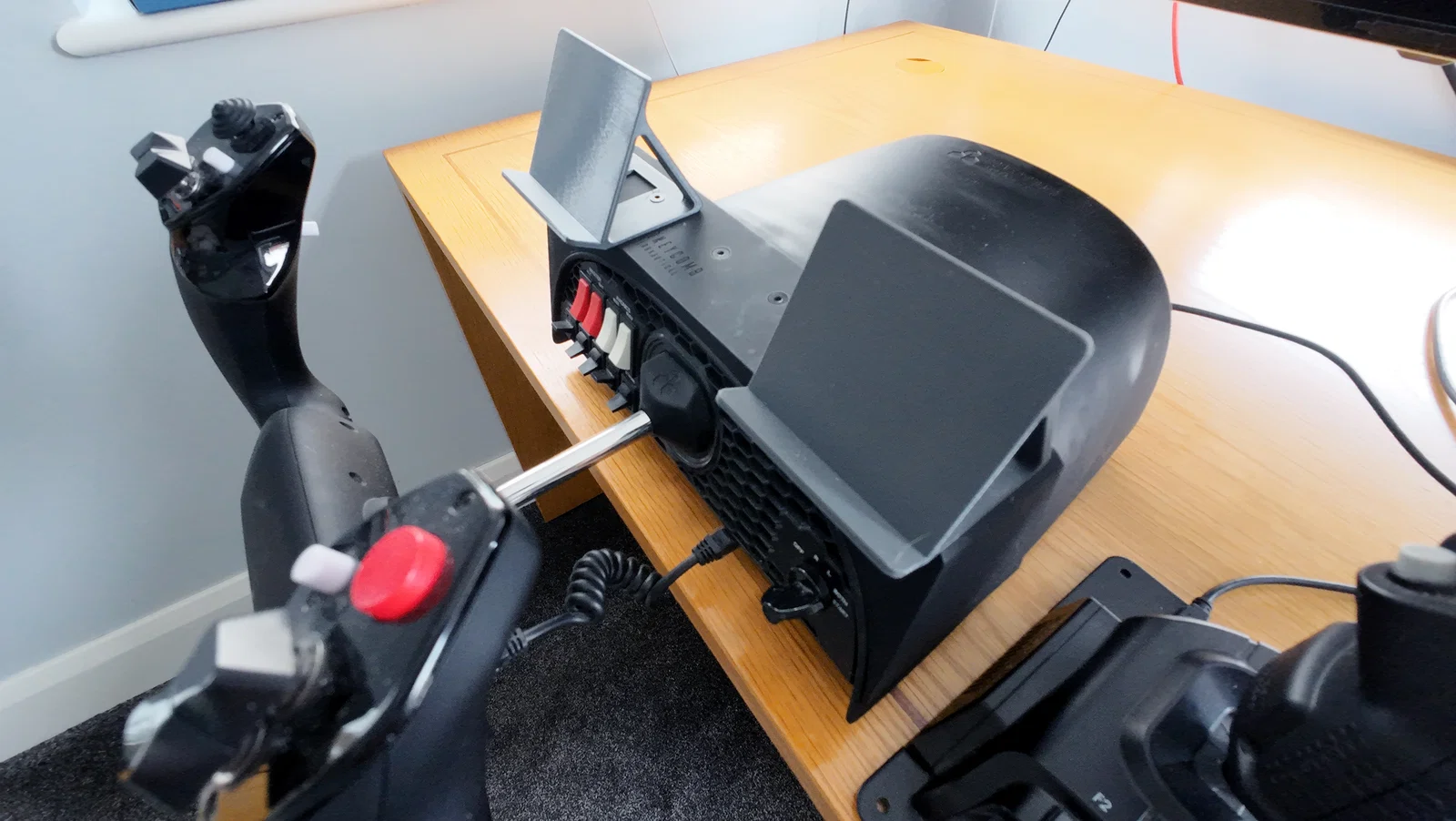 Đây là một giá đỡ nhỏ gọn dùng để gắn vào bộ khung Honeycomb hoặc Logitech, giúp bạn cố định Stream Deck, Octavi IFR1 hoặc bất kỳ thiết bị nào khác. Thiết kế này giúp bạn dễ dàng thao tác với các thiết bị trong khi bay mà không cần phải đặt trên đùi hay tìm chỗ trống trên bàn làm việc vốn đã bừa bộn. Ngoài ra, giá đỡ còn hỗ trợ bạn nhấn nút và xoay núm điều khiển một cách thuận tiện hơn.