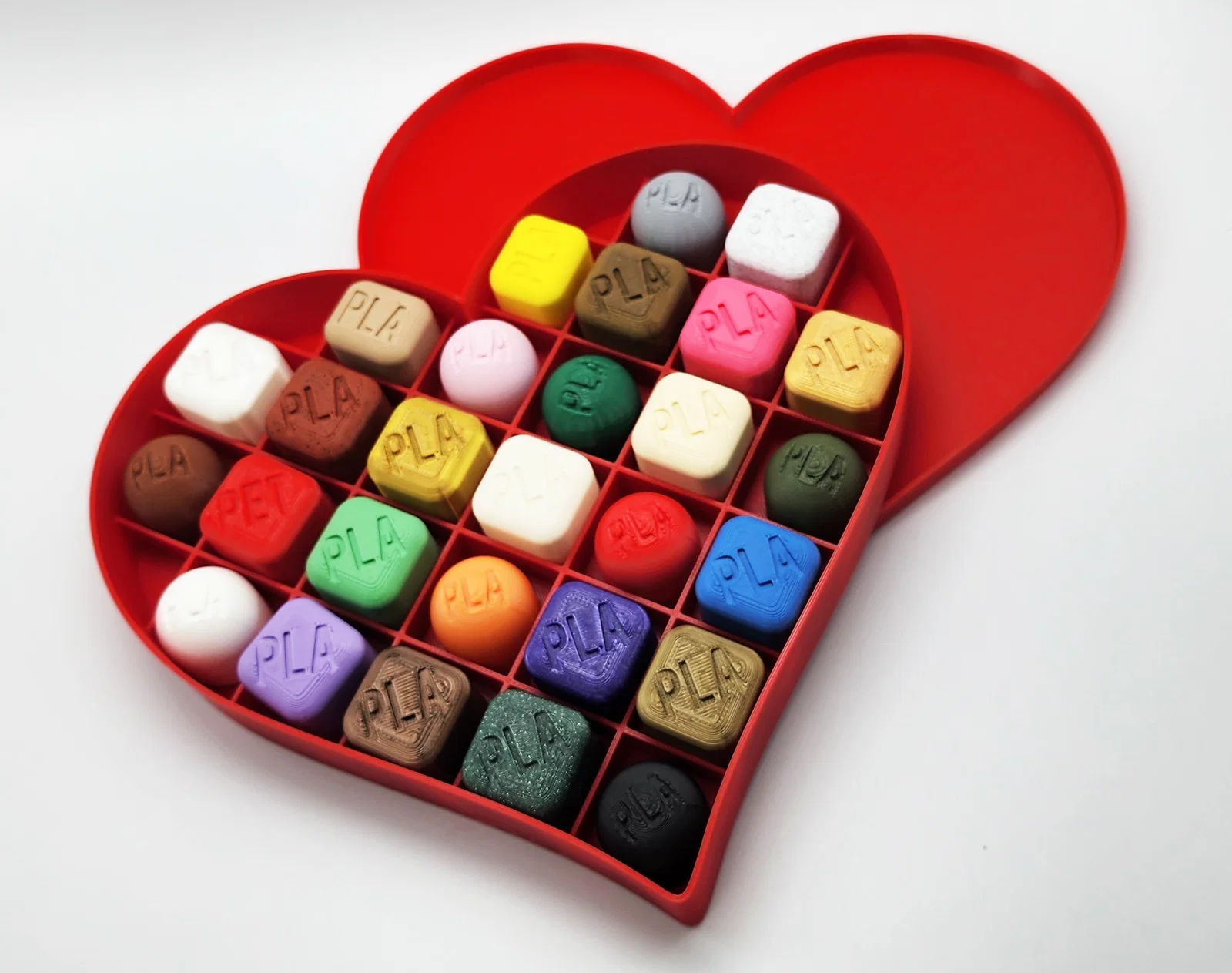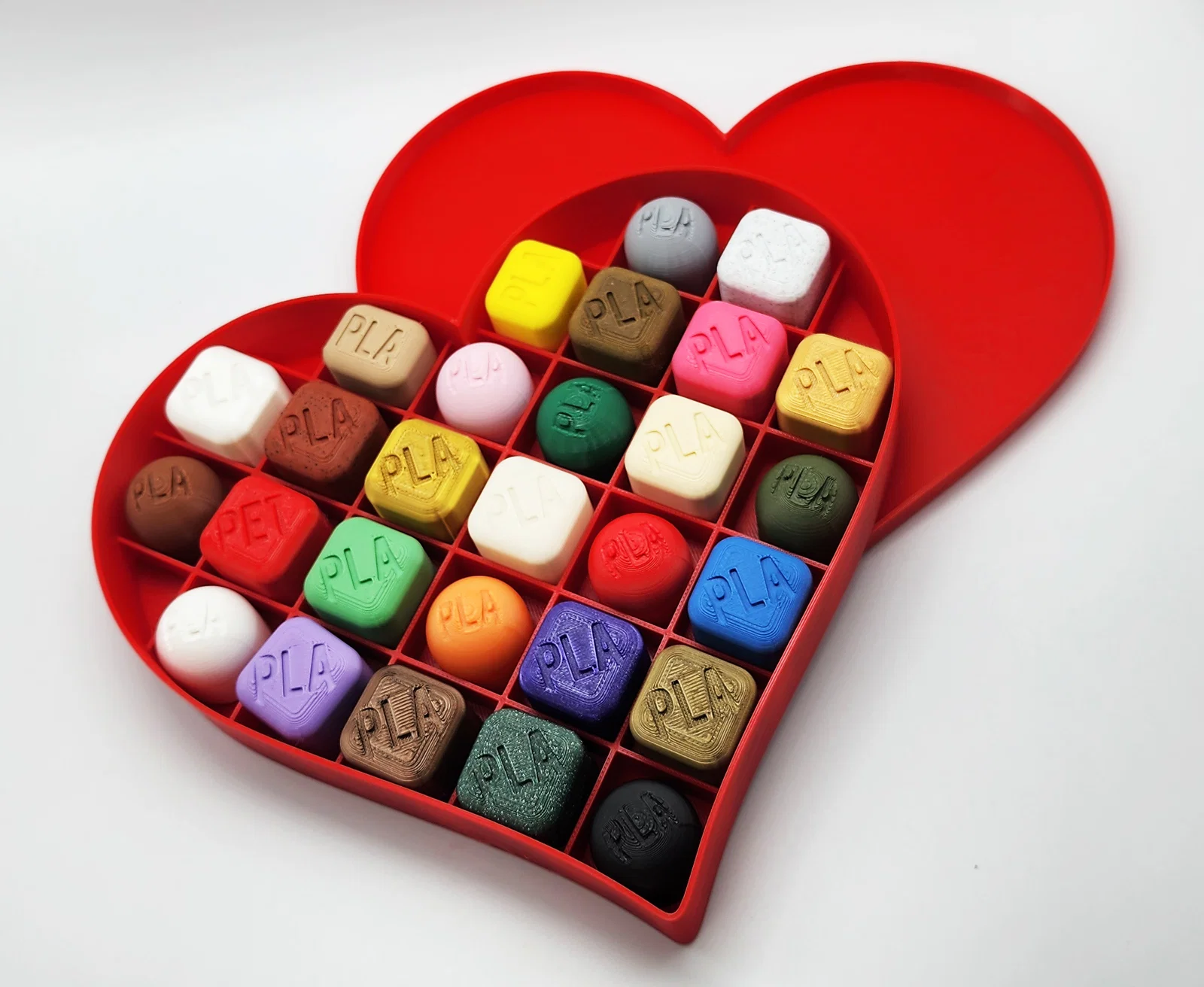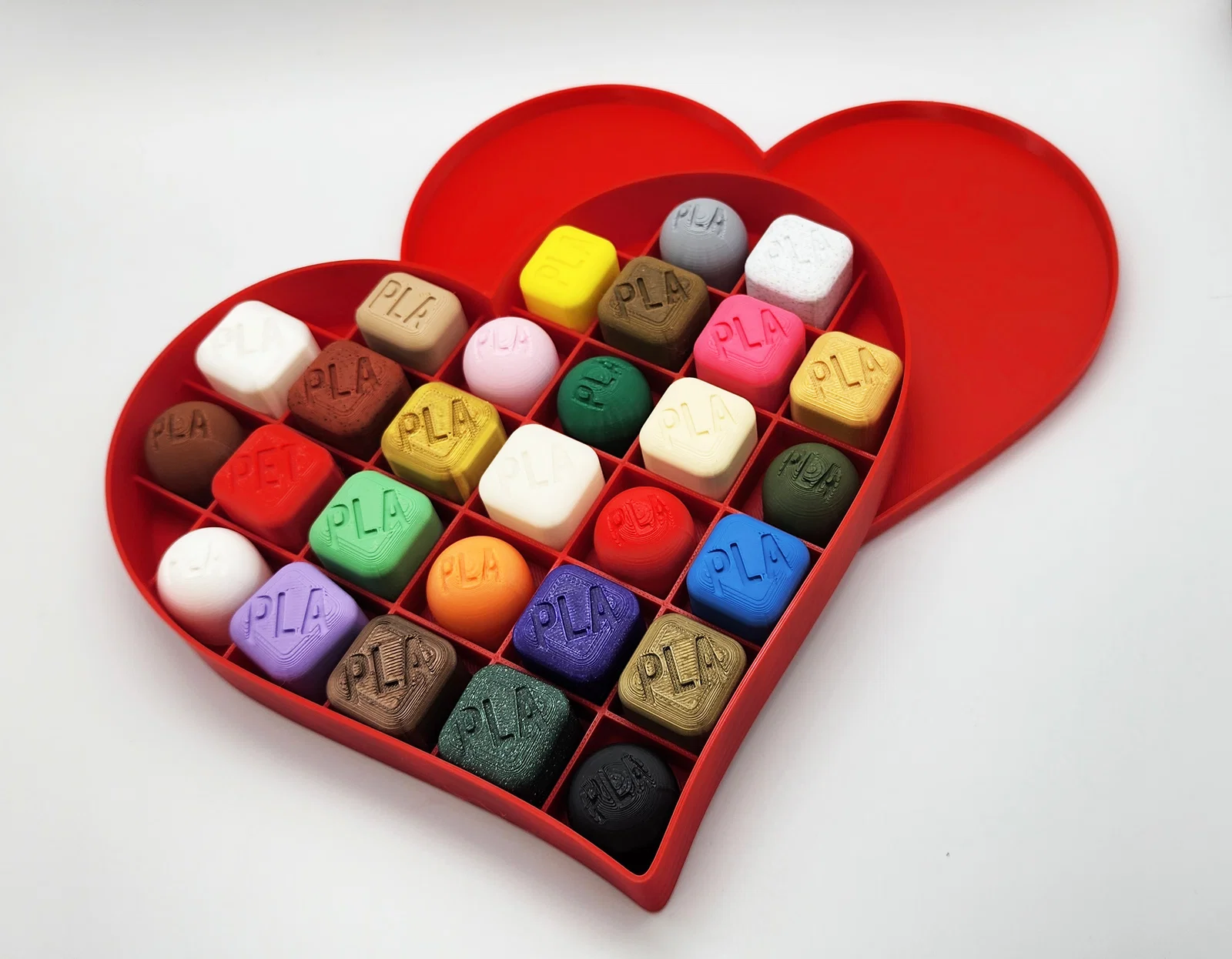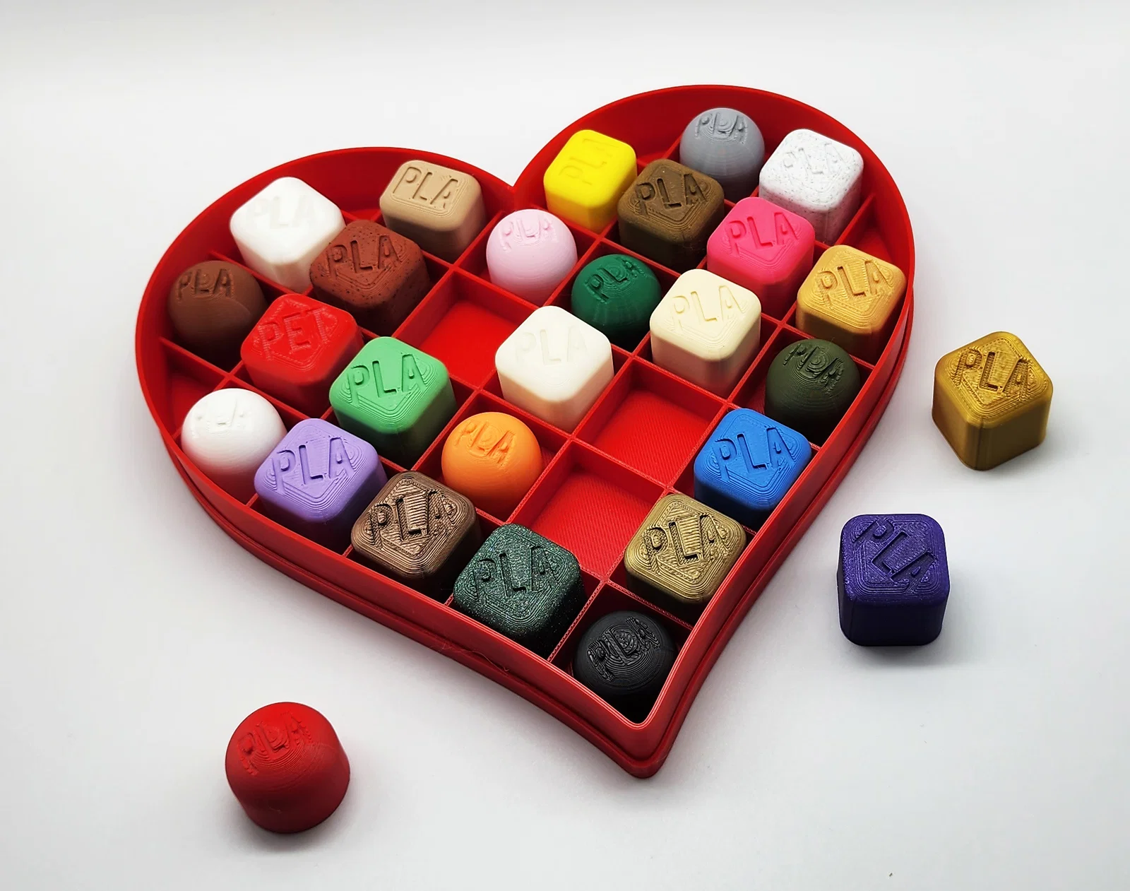 Hộp đựng kẹo hình trái tim siêu tiện lợi, vừa vặn cho máy in 3D dòng MINI! Hộp đi kèm vách ngăn chứa được 28 mẫu thử filament (24x24x24mm). Thiết kế di động có nắp đậy, cực kỳ phù hợp để sưu tầm và trưng bày các loại nhựa PLA, PET, TPU, ABS.