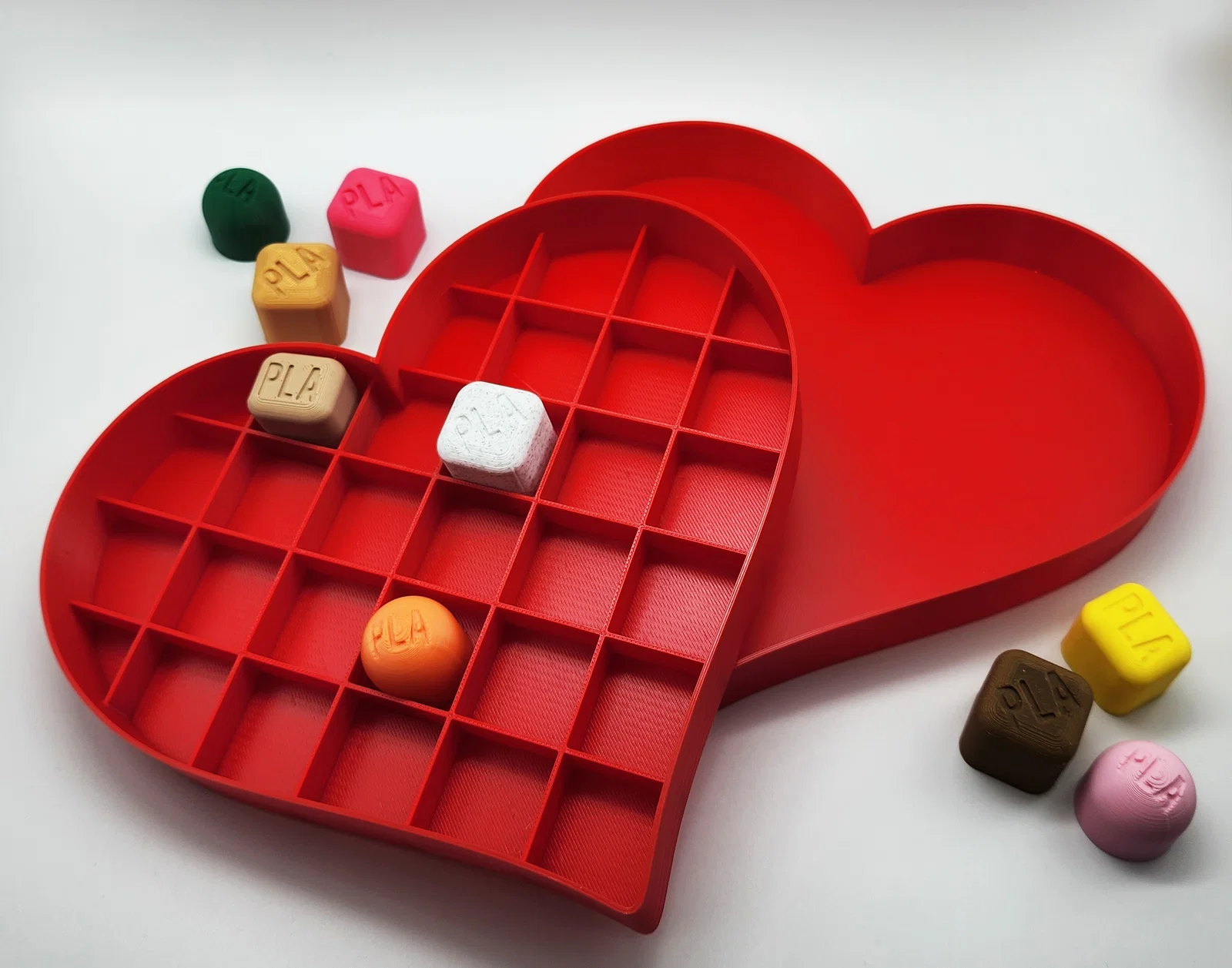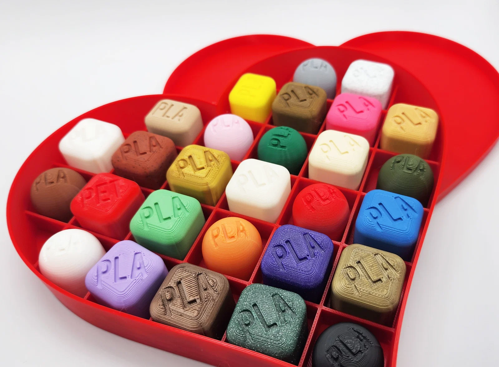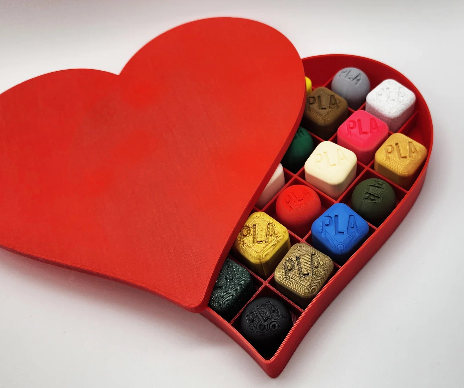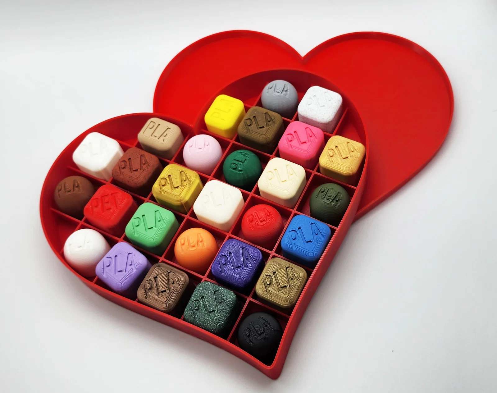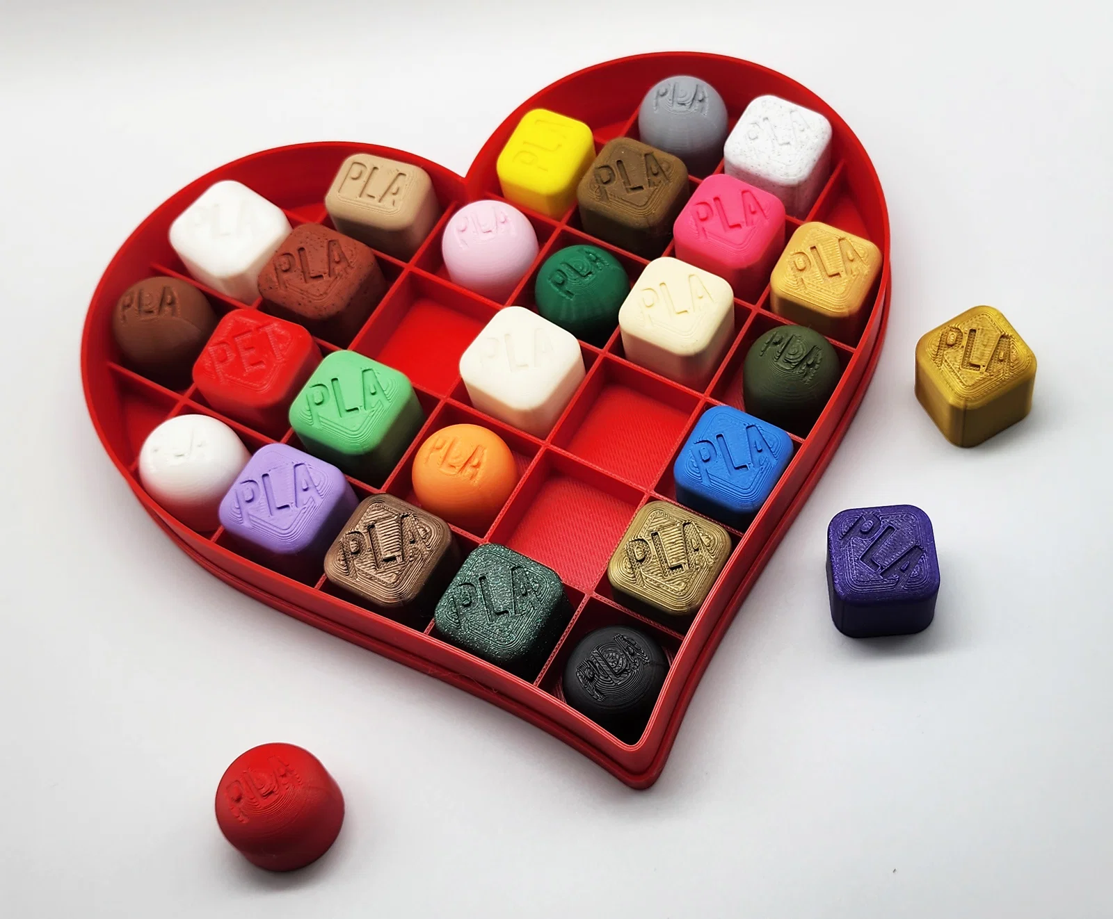 Hộp đựng kẹo hình trái tim siêu tiện lợi, vừa vặn cho máy in 3D dòng MINI! Hộp đi kèm vách ngăn chứa được 28 mẫu thử filament (24x24x24mm). Thiết kế di động có nắp đậy, cực kỳ phù hợp để sưu tầm và trưng bày các loại nhựa PLA, PET, TPU, ABS.