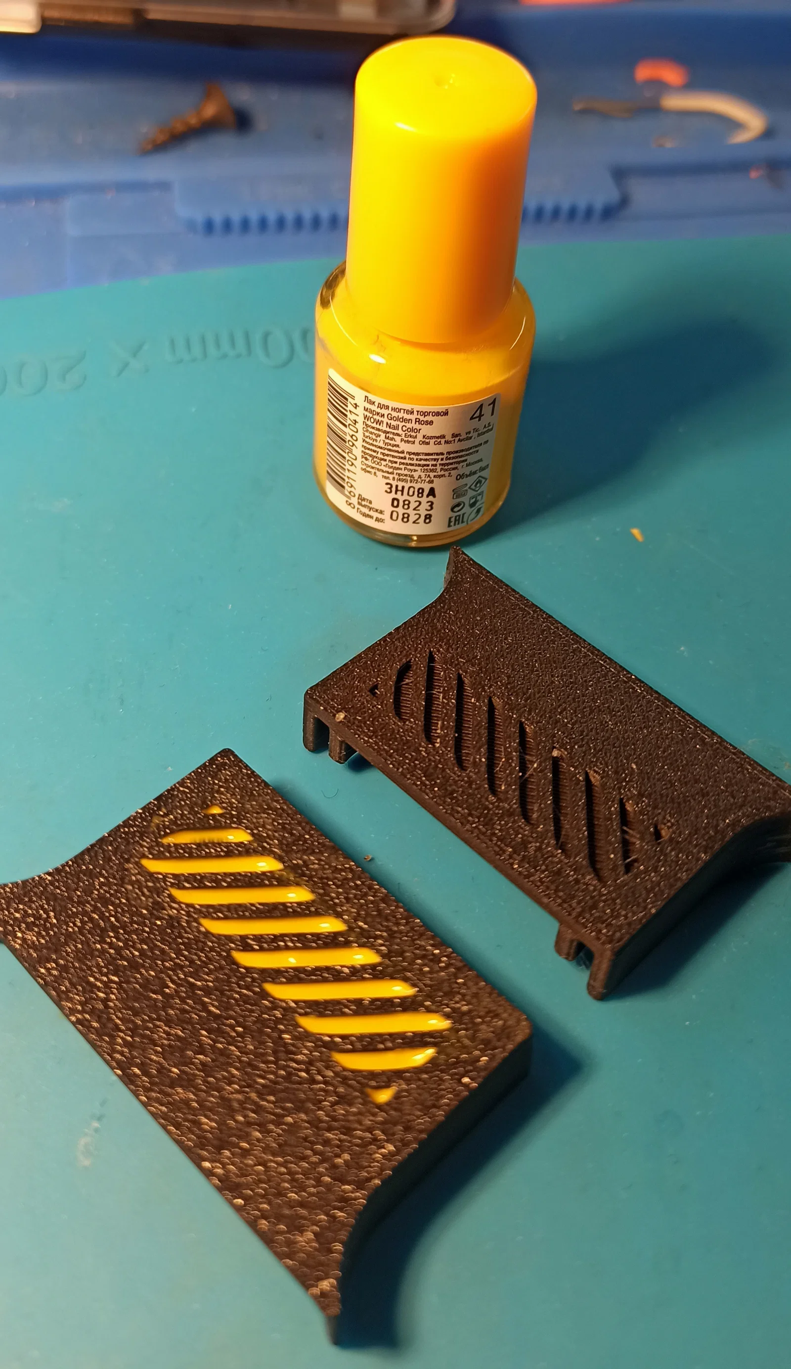 Được in bằng nhựa PLA với đầu in 0.4, chiều cao lớp in 0.19. Sơn móng tay được sử dụng để tô màu. Bạn hãy bôi một lớp vaseline lên bề mặt, sau đó đổ sơn móng tay vào và dùng bông tẩy trang lau sạch đi nhé. Mr_medvedko dushniak & diatel