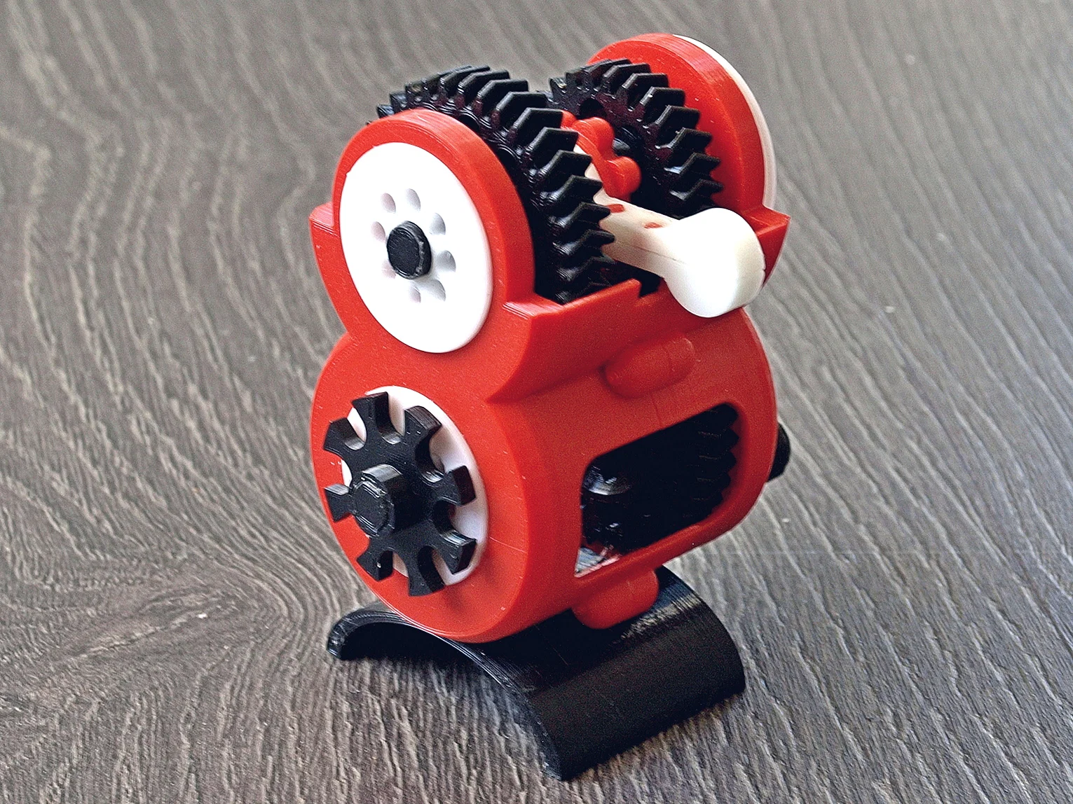 Trong loại hộp số này, tất cả các bánh răng trên trục chính đều khớp liên tục với các bánh răng tương ứng trên trục trung gian. Một bộ ly hợp dạng vấu trượt (sliding dog clutch) được trang bị trên trục chính. Tỷ số truyền bao gồm 0.75, 1.33 và số mo (neutral). Mô hình này được thiết kế bằng Tinkercad. Hộp số 3 cấp có số lùi : In và Lắp ráp Các chi tiết nên được in trên bề mặt bàn in phẳng (smooth), không nên dùng bàn in nhám (textured). Nếu có thể, hãy tránh hiện tượng chân voi (elephant foot). Tôi đã in mô hình này trên máy PRUSA MINI, sử dụng nhựa PLA+ với chiều cao lớp in 0.15 mm. Tôi có sử dụng keo dán nhựa cứng ở những vị trí cần thiết. Để xem hình ảnh lắp ráp hoàn chỉnh và bung rời, hãy dùng các file .stl có ký hiệu A0… X0… (không cần in các file này). Thứ tự in và lắp ráp theo thứ tự bảng chữ cái (A1 → X1). Bạn có thể lựa chọn giữa bánh răng thẳng (Spur) và bánh răng xương cá (Herringbone) (A4 B2). Kích thước: 95 x 63 x 101 mm. Trọng lượng: 0.1 kg. Kết nối hộp số với “4 Stroke Flathead Engine” (= 135305) In các chi tiết từ X1 → X5. Để kết nối hộp số với động cơ, cần phải tháo “Tay quay” (Cranked Handle) của động cơ ra. Động cơ, giá đỡ kết nối và hộp số sẽ được gắn vào “X1-Sled”. Quan trọng: Chi tiết “X2-Coupling Bracket” phải được lắp theo đúng hướng (theo ký hiệu MŨI TÊN). Vận hành Sử dụng tay quay để làm xoay hộp số và động cơ. Để kết nối/ngắt kết nối hộp số khỏi động cơ, hãy sử dụng “X5-Coupling Selector Fork”. Để sang số, hãy sử dụng “A3-Selector Fork”.
