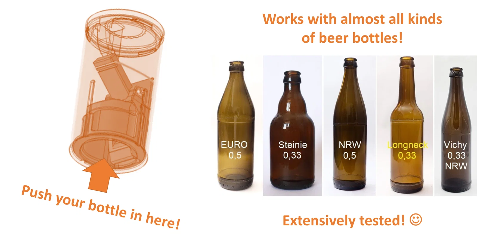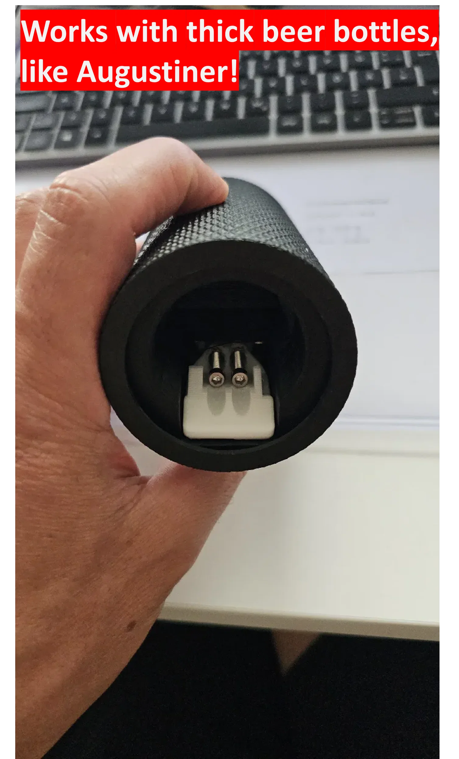 Sản phẩm này đặc biệt hữu ích trong các buổi tiệc tùng hoặc khi bạn muốn gây ấn tượng với bạn bè bằng một phụ kiện độc lạ tự tay in ấn. Khả năng tương thích của thiết bị rất cao, đã được kiểm nghiệm thực tế với nhiều loại chai phổ biến như Euro 0.5l, Steinie 0.33l, NRW 0.5l, Longneck 0.33l và cả những chai bia Đức có nắp dày như Augustiner. Với thiết kế nhỏ gọn, cầm vừa tay, đây chắc chắn là món đồ không thể thiếu trong gian bếp hoặc quầy bar tại gia của các tín đồ 3D printing.
