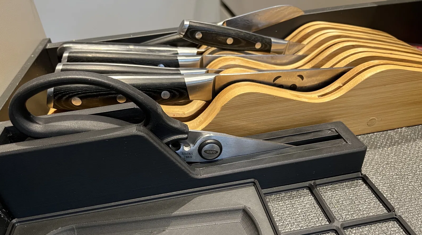 Giá đỡ Gridfinity 6x1 cho một cặp kéo nhà bếp và cắt rau gia vị Oxo Good Grips