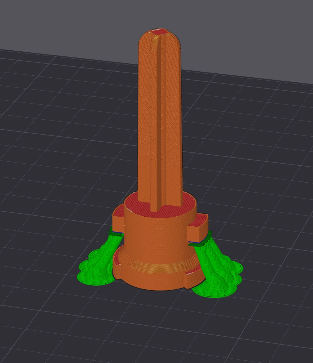Hãy in theo chiều hướng được thiết lập sẵn với infill 100% và tối thiểu 8 lớp tường (walls). Bạn nên dùng loại nhựa càng cứng càng tốt; tất nhiên là bạn không muốn nó bị gãy lần nữa đâu. Chất liệu như Nylon CF có lẽ là lựa chọn tối ưu nhất, nhưng ngay cả PLA cũng có thể dùng được khá lâu. Bản in này chỉ tốn khoảng một giờ và 10g nhựa trên máy Bambu P1S, nên nếu lỡ có gãy cũng không thành vấn đề lớn. Tôi khuyên bạn nên sử dụng tree support để hỗ trợ phần chốt khóa như trong hình này: