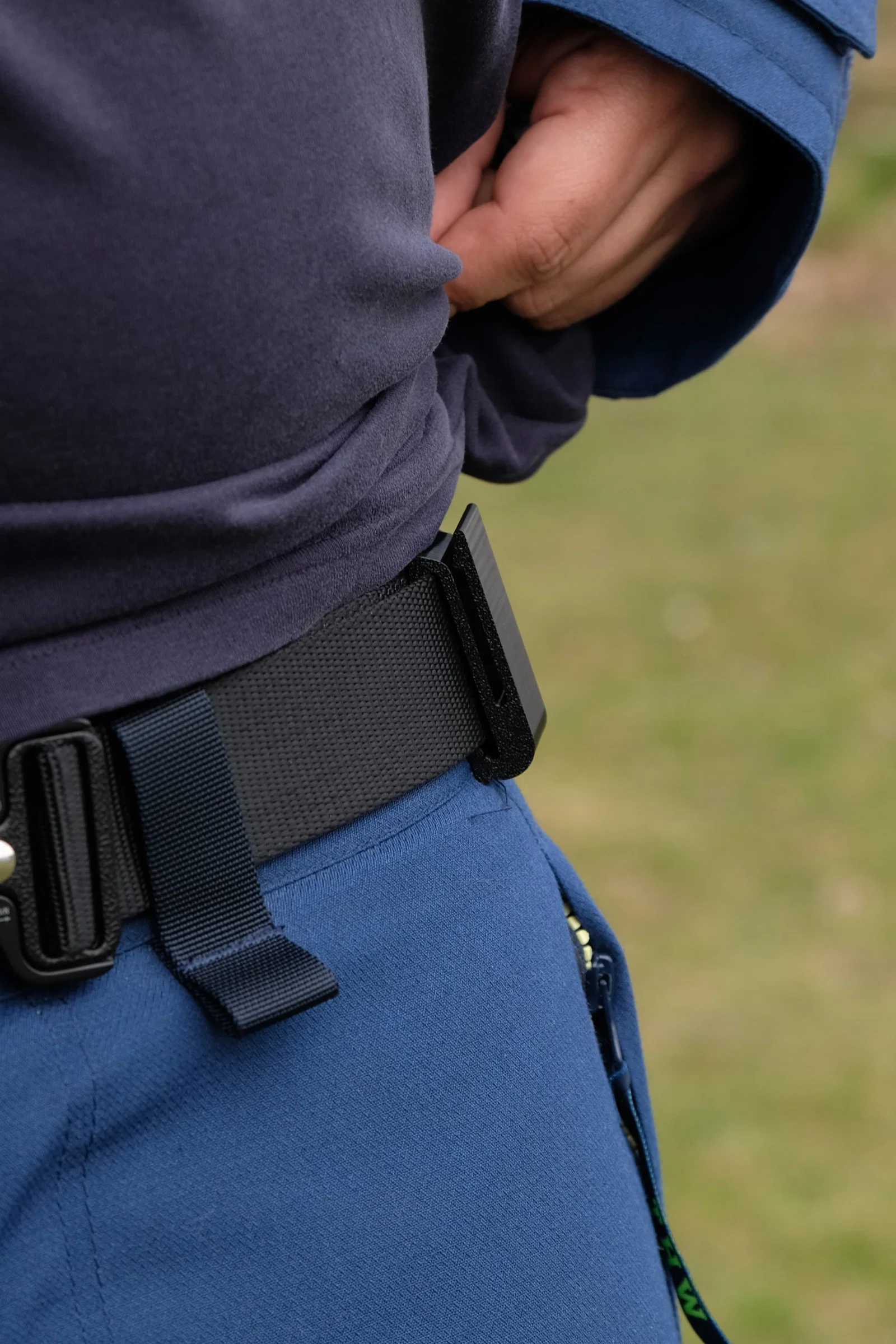 Luồn thắt lưng qua kẹp. Rất chắc chắn nhưng cần tháo thắt lưng khi lắp. Không phù hợp với dây thắt lưng đi kèm MEA 2.0. Kích thước tối đa: cao 46,5mm, dày 3,5mm.