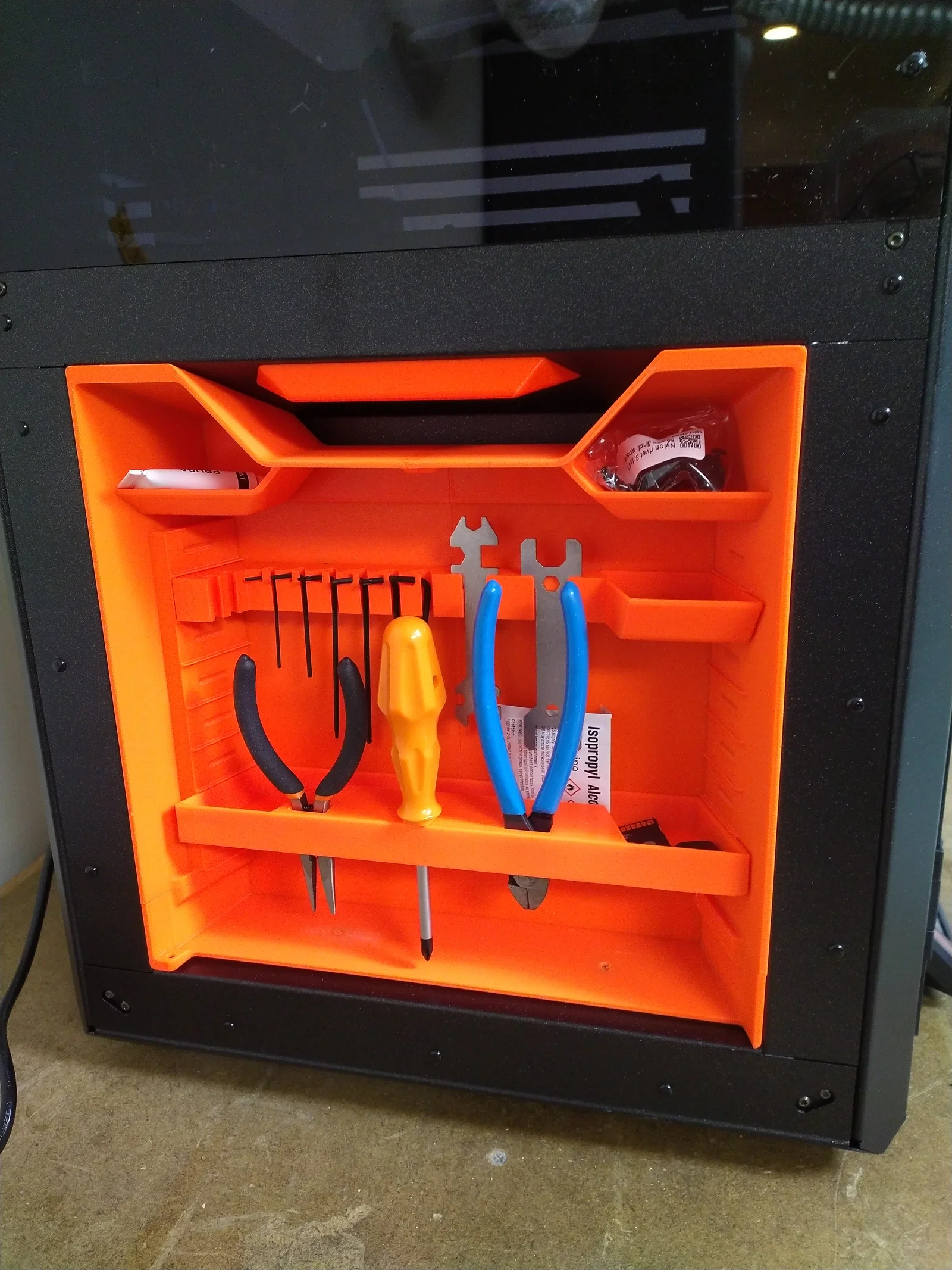 Phần mở rộng giá treo dụng cụ tiện lợi cho Prusa Core One. Giúp bạn sắp xếp gọn gàng tua vít, kìm mũi nhọn và kìm cắt chéo đi kèm máy, đồng thời bổ sung thêm không gian lưu trữ phụ. Cần dùng keo dán để lắp đặt cố định.