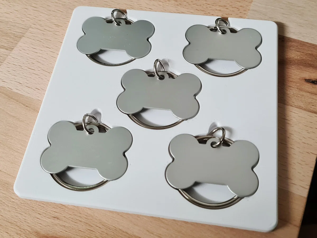 Sản phẩm này cực kỳ tiện dụng cho những ai làm dịch vụ quà tặng hoặc kinh doanh phụ kiện thú cưng tại nhà. Thiết kế của khuôn cho phép bạn đặt 5 chiếc thẻ vào đúng vị trí một cách dễ dàng, với phần khoen tròn được đặt hướng lên trên theo tiêu chuẩn. Nhờ cấu trúc phẳng và vừa vặn, máy xTool F1 có thể quét và khắc chính xác trên bề mặt của từng chiếc thẻ mà không cần phải căn chỉnh lại nhiều lần, giúp bạn tiết kiệm đáng kể thời gian và vật liệu trong quá trình làm việc.