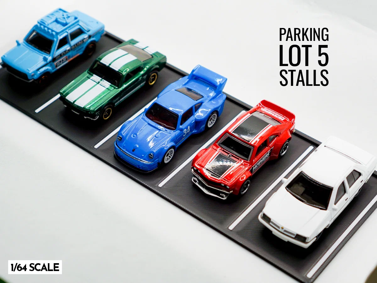 Bãi đậu xe đơn giản gồm 5 ô đậu, thiết kế cho diorama tỉ lệ 1:64 và xe diecast. Dễ kết hợp với nhiều bộ mô hình để lấp đầy khung cảnh. File đã được slice bằng Bambu Studio và in trên máy Bambu Lab.