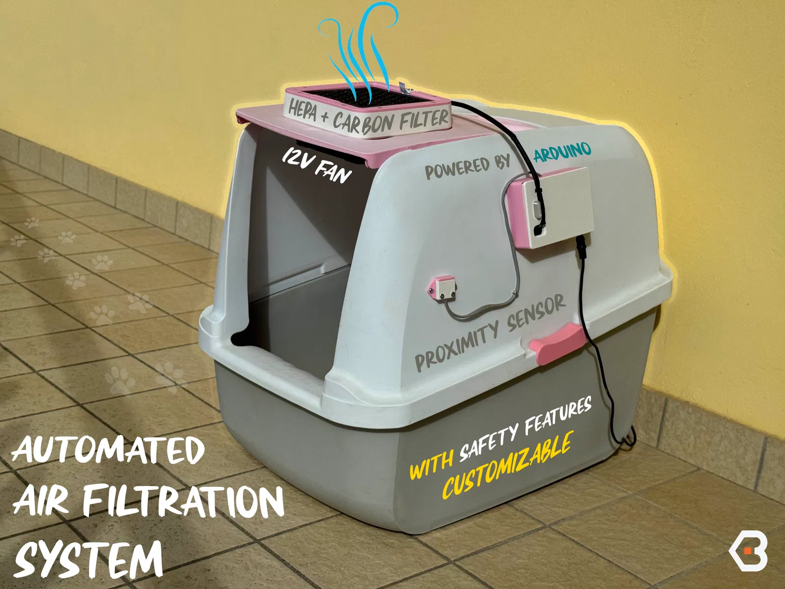 Đây là hệ thống lọc không khí đa năng, sử dụng Arduino được thiết kế để gắn lên hầu hết các loại khay vệ sinh cho mèo. Mục tiêu của dự án này rất đơn giản: tự động loại bỏ mùi hôi sau khi mèo sử dụng khay, đồng thời đảm bảo an toàn tối đa và không gây ồn ào khó chịu.