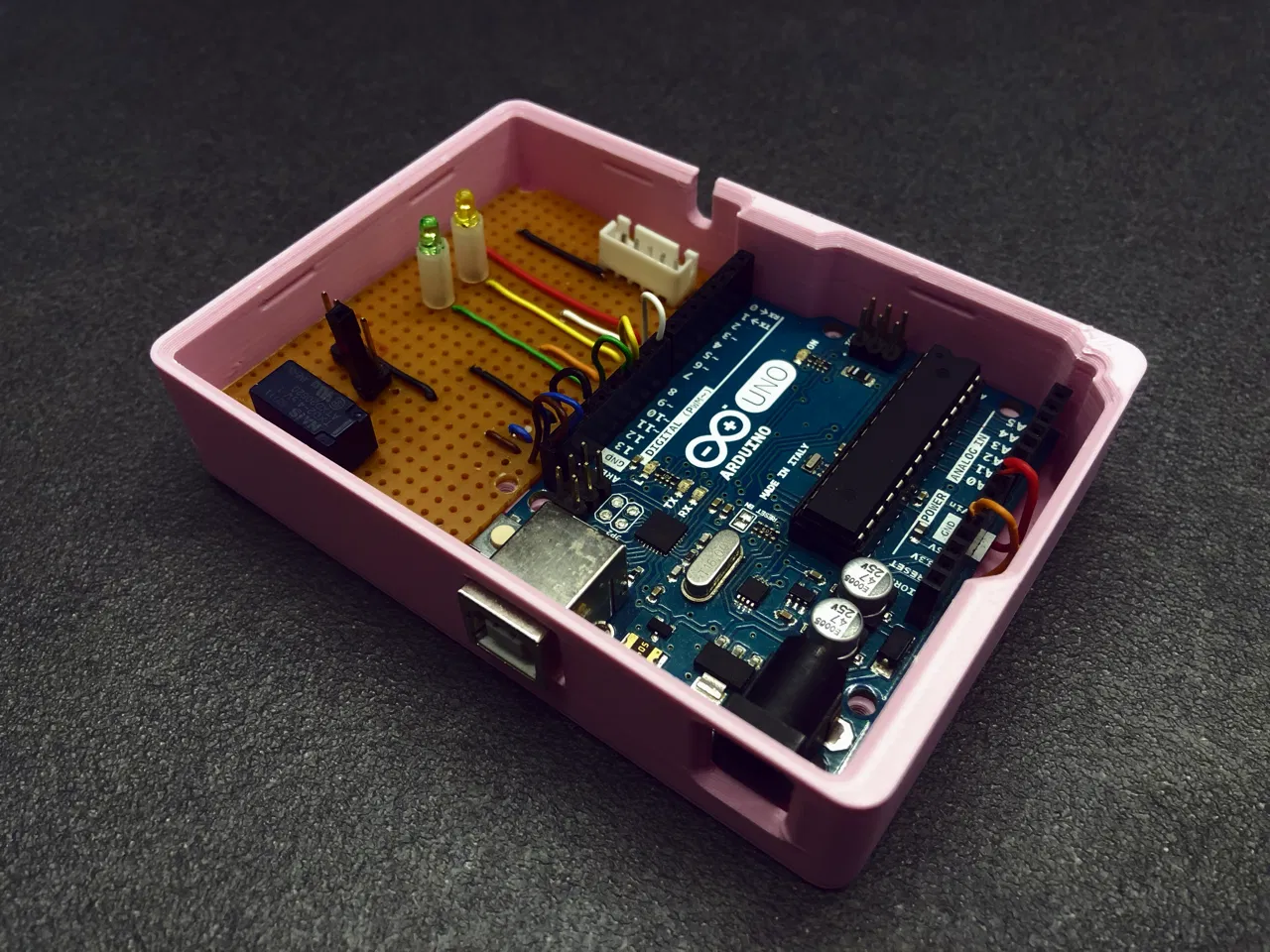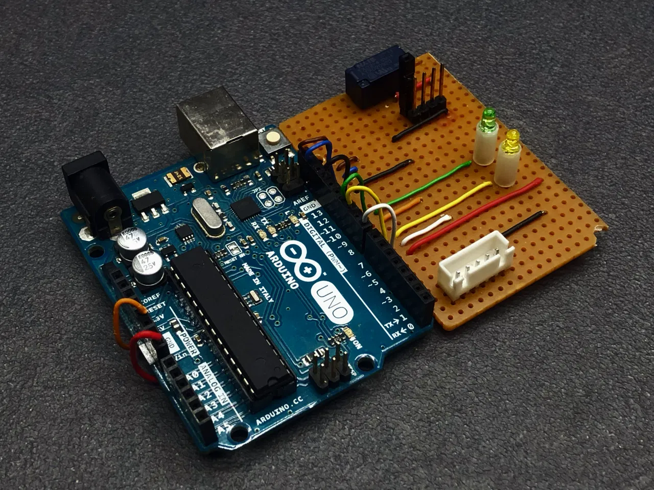 Các linh kiện điện tử được lắp ráp trên perfboard (bo mạch đục lỗ) và hàn thủ công. Nguồn điện được cung cấp qua bộ nguồn 12V kết nối trực tiếp với Arduino, ngoài ra hệ thống cũng hỗ trợ pin 12V. Khi dùng pin, mã nguồn sẽ có thêm tính năng giám sát điện áp: nếu pin tụt xuống dưới ngưỡng an toàn, hệ thống sẽ tự động tắt để tránh xả pin quá mức, đồng thời đèn LED màu cam sẽ nháy nhanh 3 lần để báo hiệu cần sạc lại.