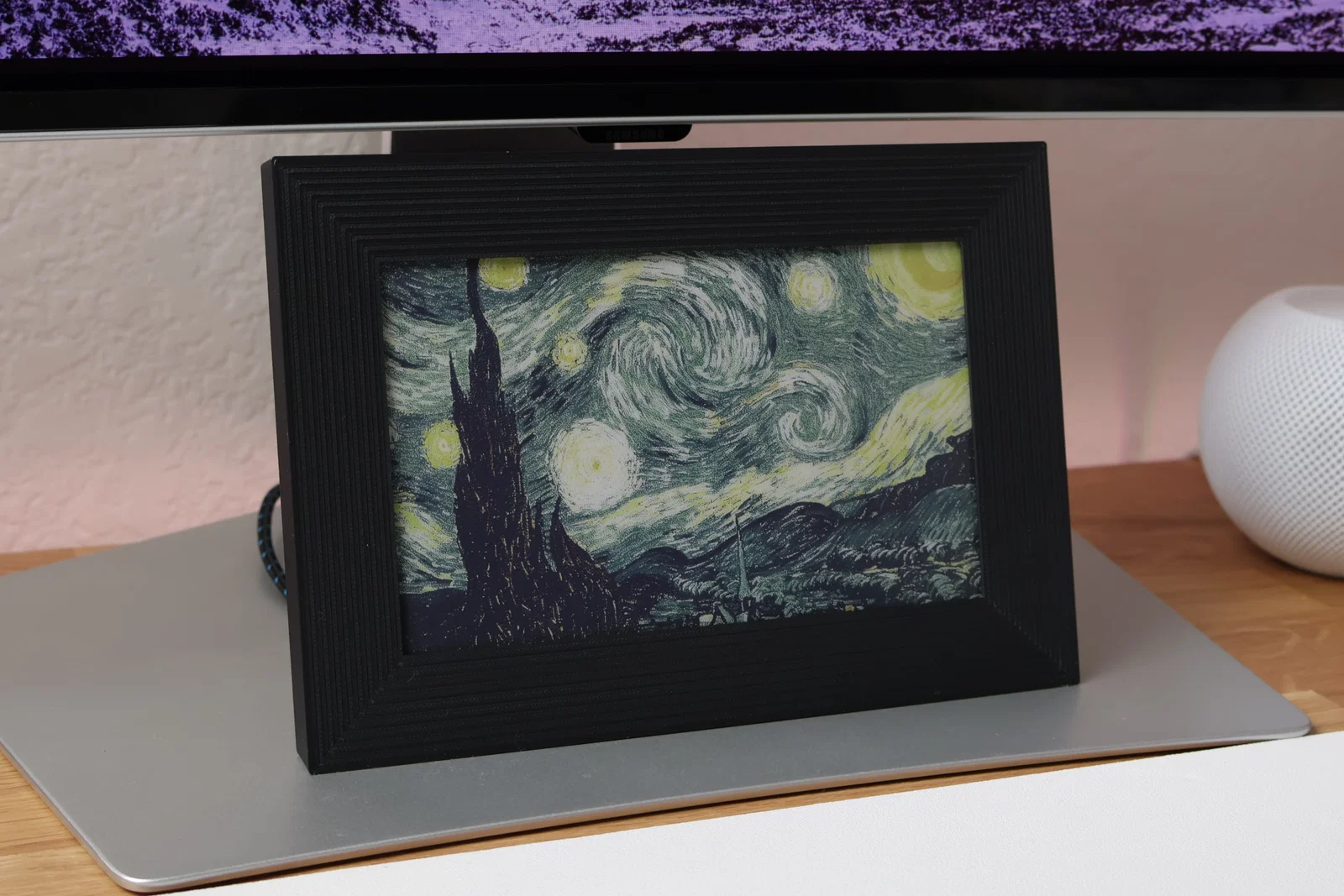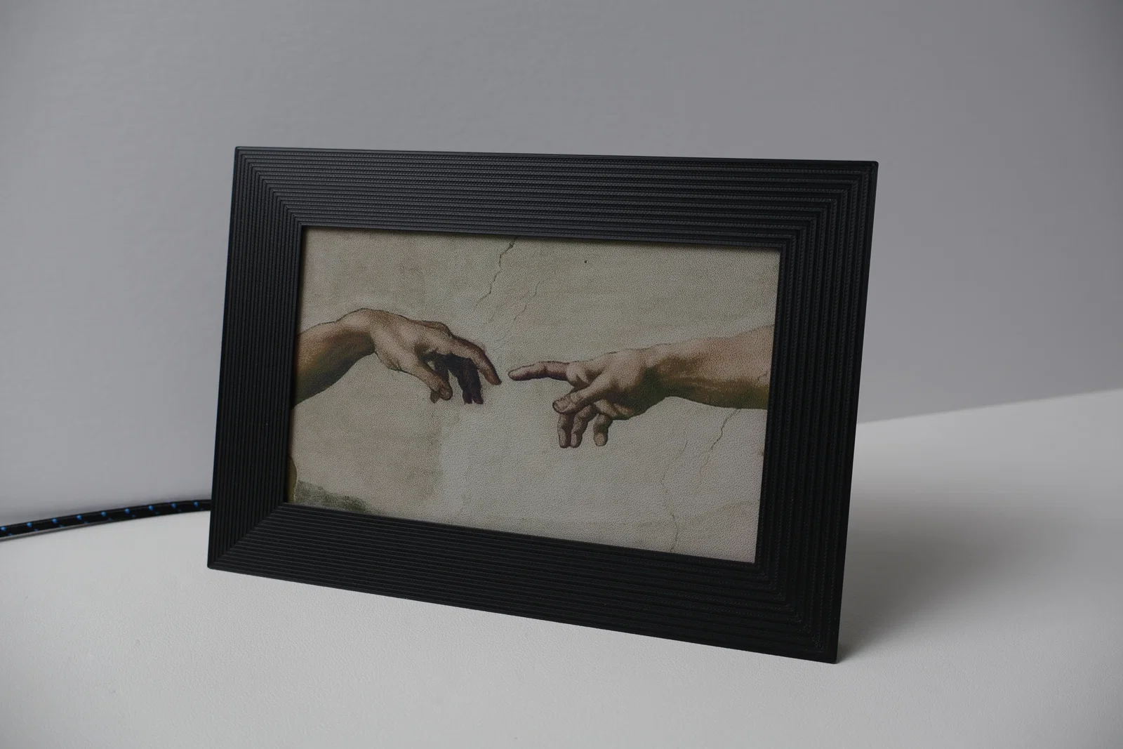 Điểm đặc biệt của dự án này chính là sự kết hợp giữa tính nghệ thuật và công nghệ. Khung tranh được in 3D với các đường nét tinh xảo, tạo vẻ ngoài chuyên nghiệp như những bộ khung gỗ truyền thống. Mặt sau của khung được thiết kế thông minh để giấu gọn phần bo mạch điều khiển, giúp sản phẩm trông vô cùng tối giản và gọn gàng khi đặt trên bàn làm việc. Màn hình eInk không bị chói dưới ánh đèn, tạo ra trải nghiệm thị giác dịu nhẹ, rất phù hợp để trình chiếu các tác phẩm hội họa hoặc ảnh chụp yêu thích.