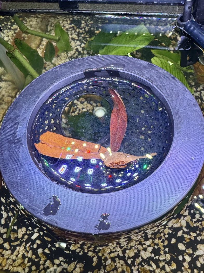 Phần vòng tròn phía trên là không gian rỗng với hai lớp vách, cung cấp đủ độ nổi để nó có thể lơ lửng trên mặt nước. Bọn mình có nhét thêm vài miếng lá bàng khô xuyên qua các lỗ Voronoi vì con cá Betta nhà mình rất thích chơi với chúng, nhưng tất nhiên đây chỉ là tùy chọn thôi nha.
