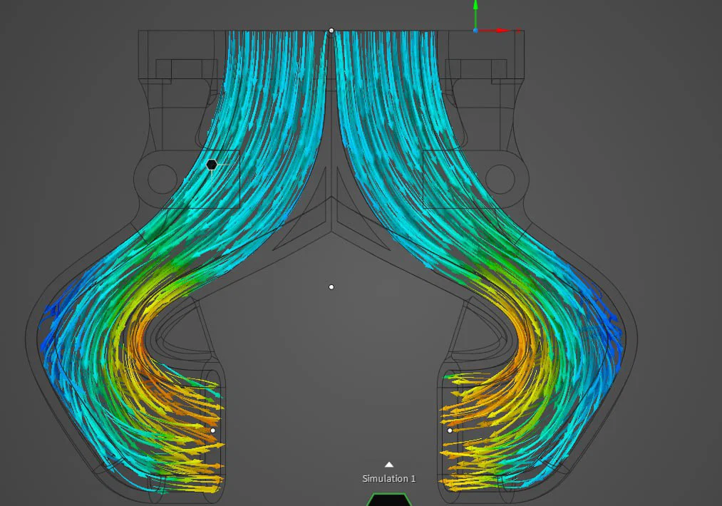 Thiết kế này bao gồm cả phần ống dẫn chính và ống dẫn phụ phía trên, đảm bảo luồng không khí đi qua một cách mượt mà nhất mà không bị thất thoát áp suất. Thông qua các mô phỏng dòng chảy, model này được tinh chỉnh để chia luồng khí đều sang hai bên, giúp nhựa nóng được làm cứng lại nhanh chóng ngay sau khi thoát ra khỏi đầu phun. Điều này giúp hạn chế tối đa tình trạng nhựa bị biến dạng hoặc hiện tượng chảy xệ khi in ở tốc độ cao.