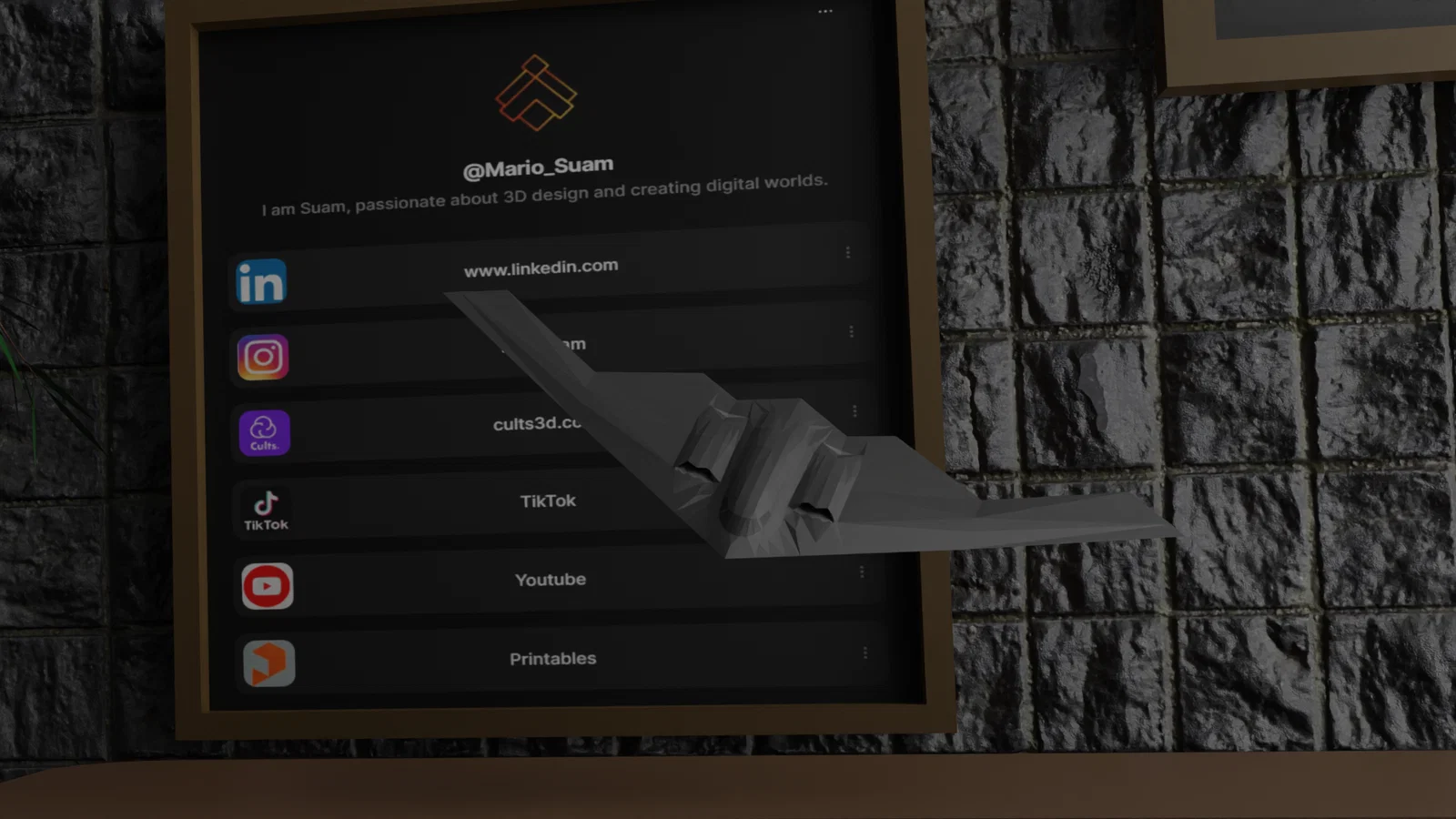 Công nghệ: FDM hoặc Resin Chất liệu: PLA (cho bề mặt mịn), PETG (độ bền cao), hoặc ABS (chịu nhiệt tốt) Độ dày lớp in (Layer Height): 0.12–0.2 mm để đạt độ cong mịn màng Hỗ trợ (Supports): Có (đặc biệt cho phần dưới cánh và hốc hút gió động cơ) Infill: 10–15% (đủ nhẹ nhưng vẫn đảm bảo độ cứng) Hướng in: Đặt phẳng cánh trên bàn in, nghiêng nhẹ về phía trước Hoàn thiện: Sơn màu đen nhám hoặc xám tàng hình, có thể thêm hiệu ứng phong hóa để tăng độ chân thực