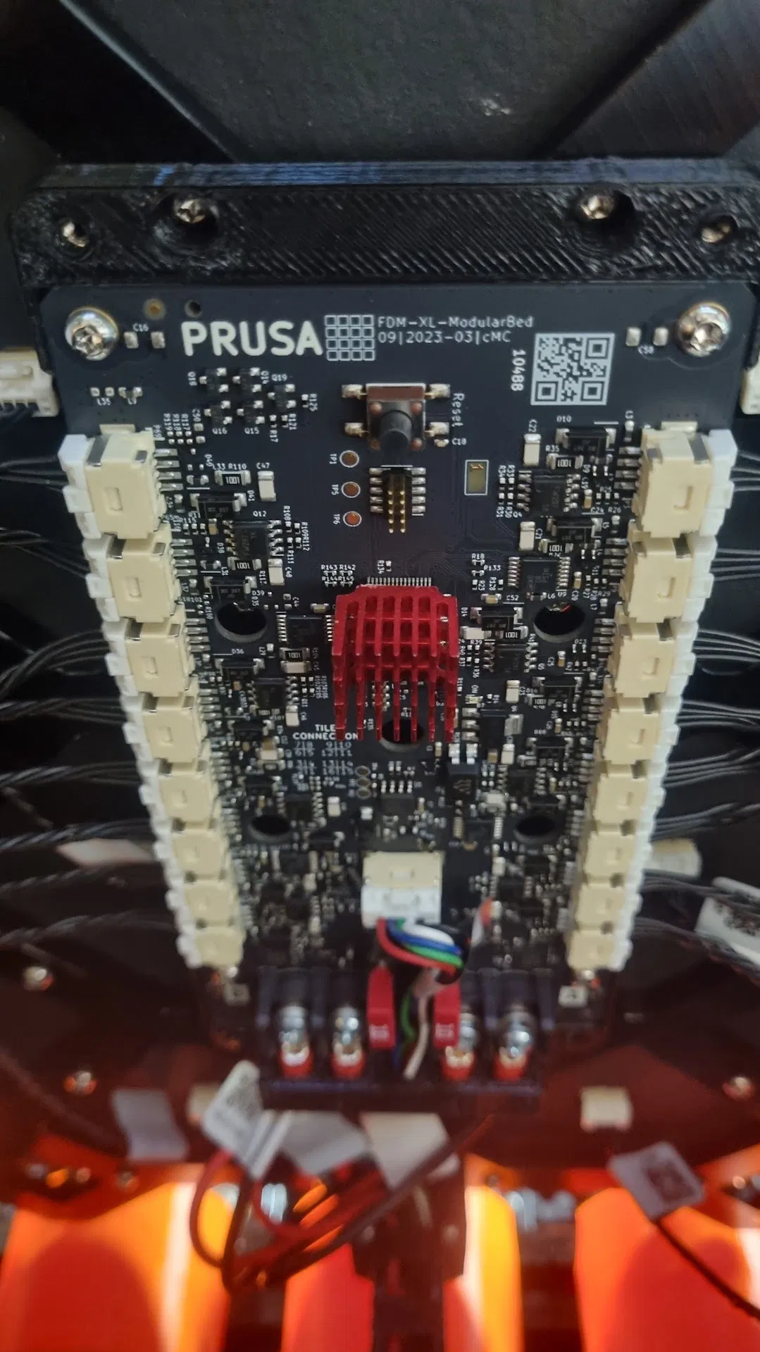 Nắp che bộ điều khiển bàn nhiệt Prusa XL đã được cải tiến giúp tản nhiệt chủ động cho MCU. Phiên bản V2 bổ sung hỗ trợ chống cong vênh và tùy chọn công tắc nhiệt thông minh.