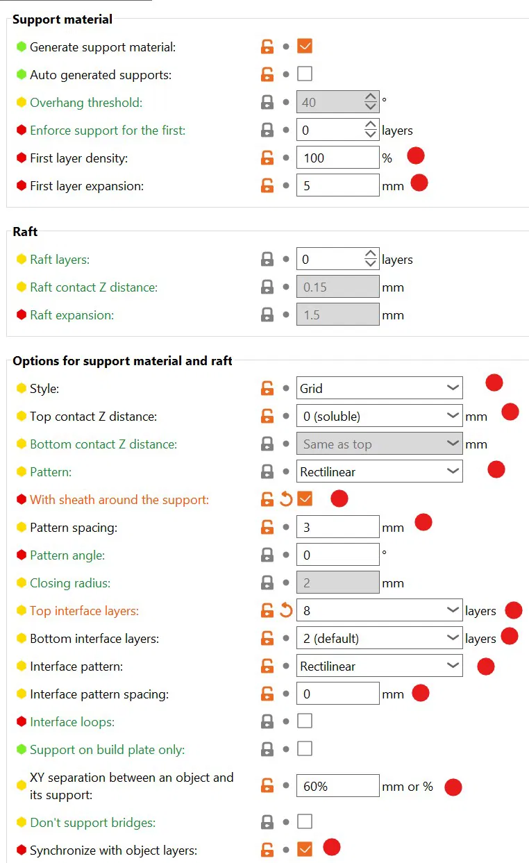Để có kết quả tốt nhất, hãy dùng cùng loại vật liệu in để làm support, nhưng hãy dùng TPU 95A hoặc cứng hơn làm vật liệu giao tiếp (interface material) và cài đặt thông số support như trong ảnh chụp màn hình. Support sẽ được tách ra dễ dàng và mặt dưới bản in sẽ trông như thể được in trực tiếp trên mặt bàn in vậy.