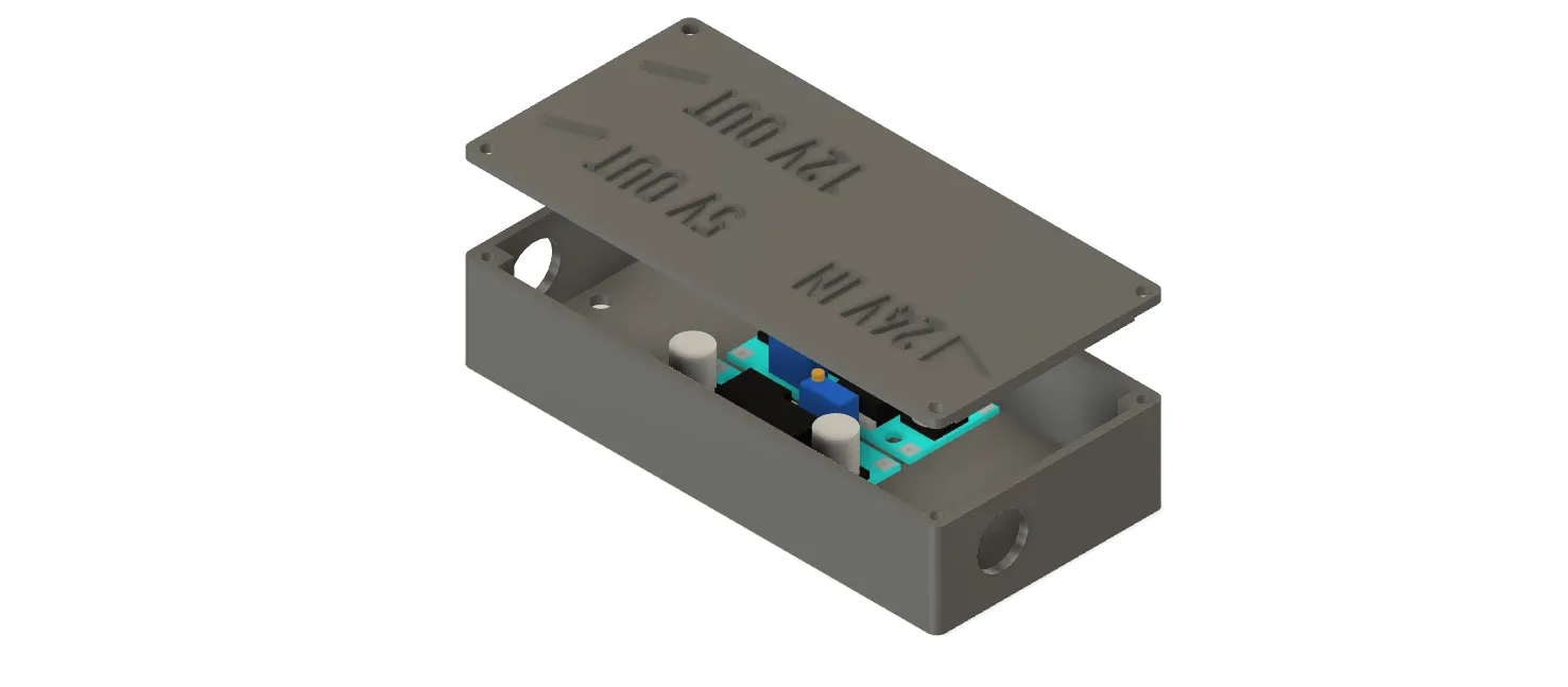 Một trường hợp đơn giản được thiết kế để vừa với các lỗ ren ở đáy hộp, và chứa một cặp mô-đun chuyển đổi DC-DC (LM2596)