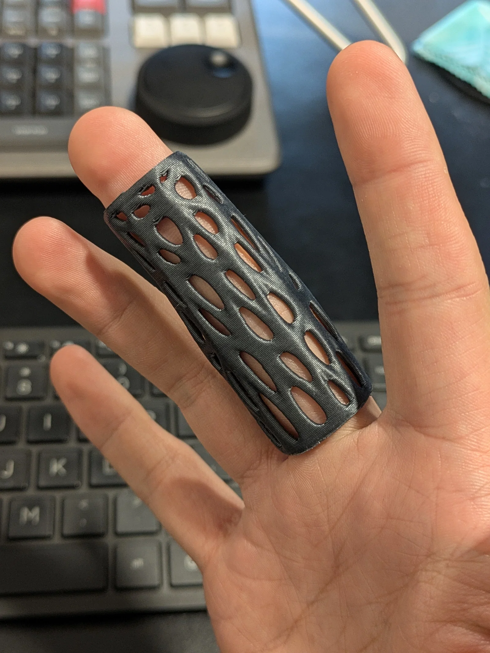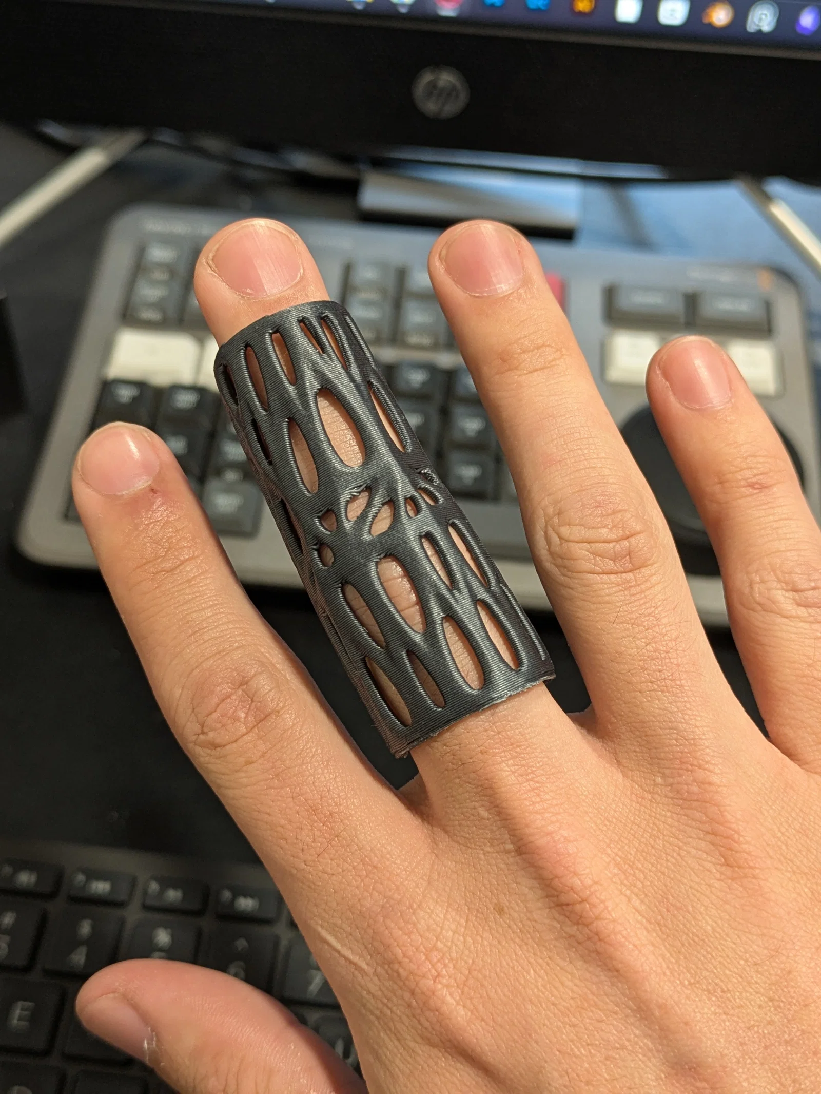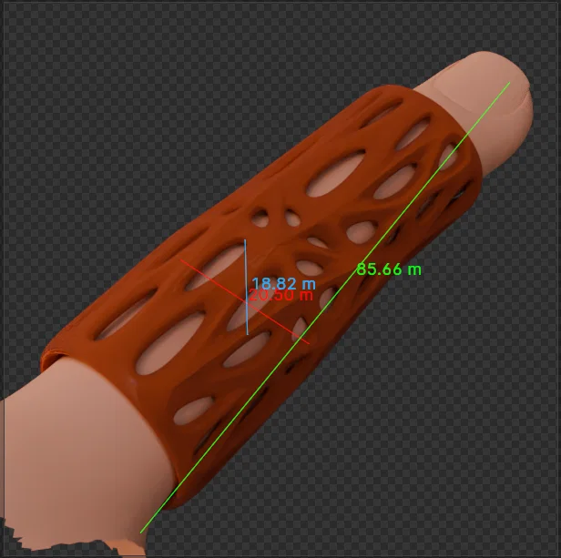 Một mẫu nẹp ngón giữa dạng Voronoi đơn giản giúp hỗ trợ khớp PIP. Thiết kế này có thể in dễ dàng mà không cần hỗ trợ. Bạn nên tùy chỉnh tỉ lệ trong phần mềm 3D để đảm bảo vừa vặn nhất với ngón tay của mình.