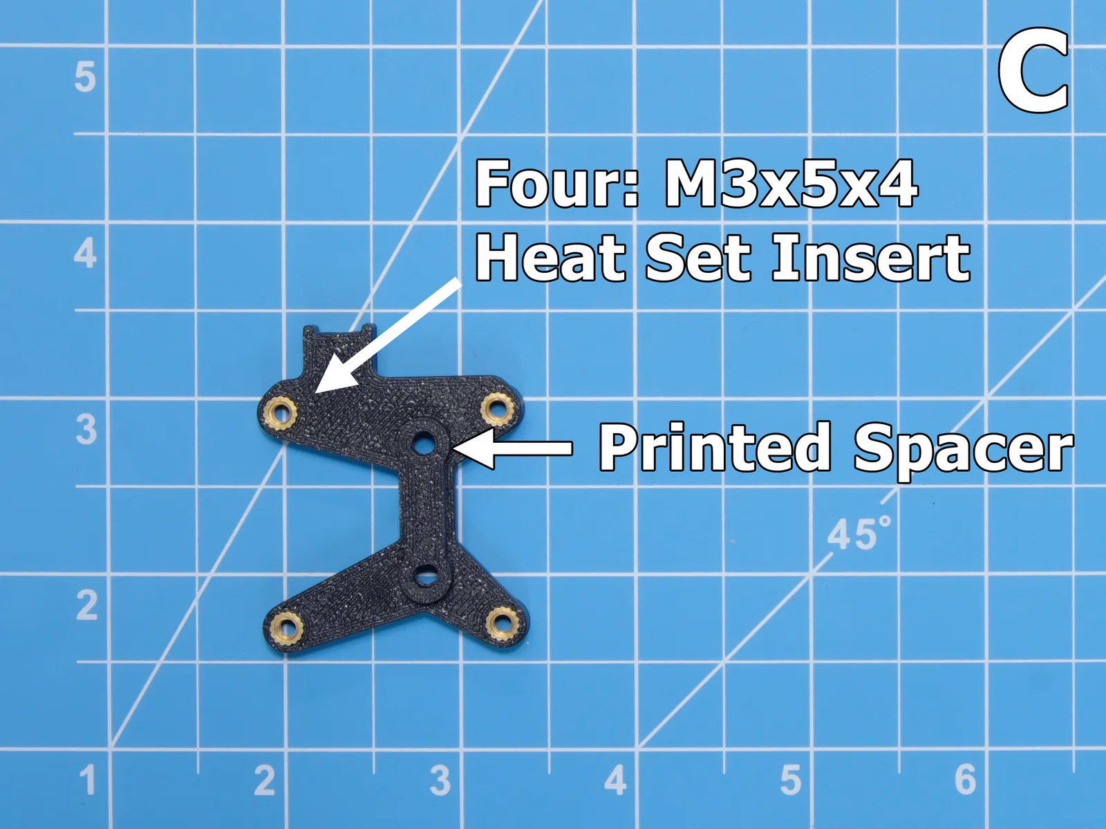 3. Hình B, C. Bạn cần 5 Heat Set Inserts cho các miếng đệm này. Gắn chúng vào máy đùn bằng ốc M3x10 đầu bằng. Đừng quên miếng đệm in (printed spacer) để đảm bảo bánh răng máy đùn cách xa các linh kiện trên board PCB.