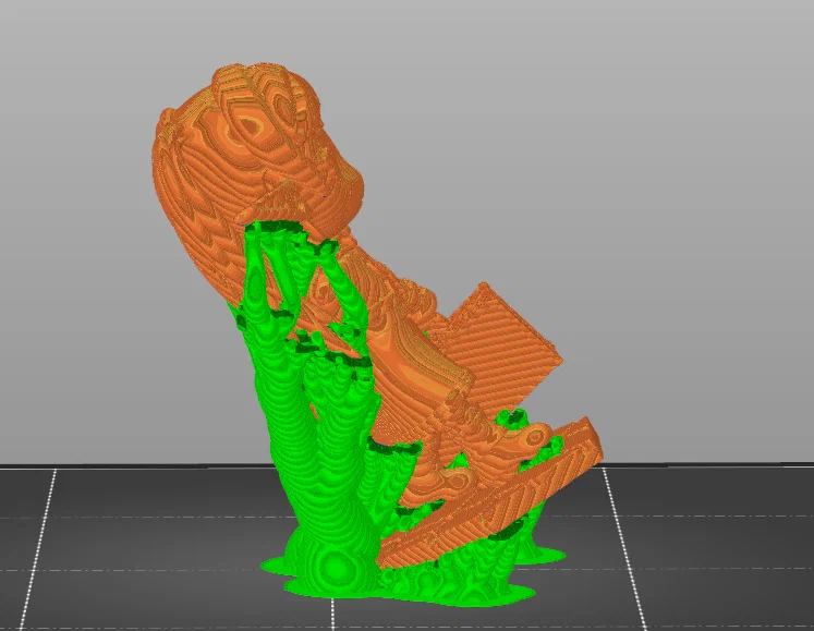 - Bắt buộc phải dùng support. Mình dùng tính năng "automatic painting" trong PrusaSlicer, sau đó thêm support thủ công ở dưới phần đế và tai, đồng thời xóa bớt các support không cần thiết.