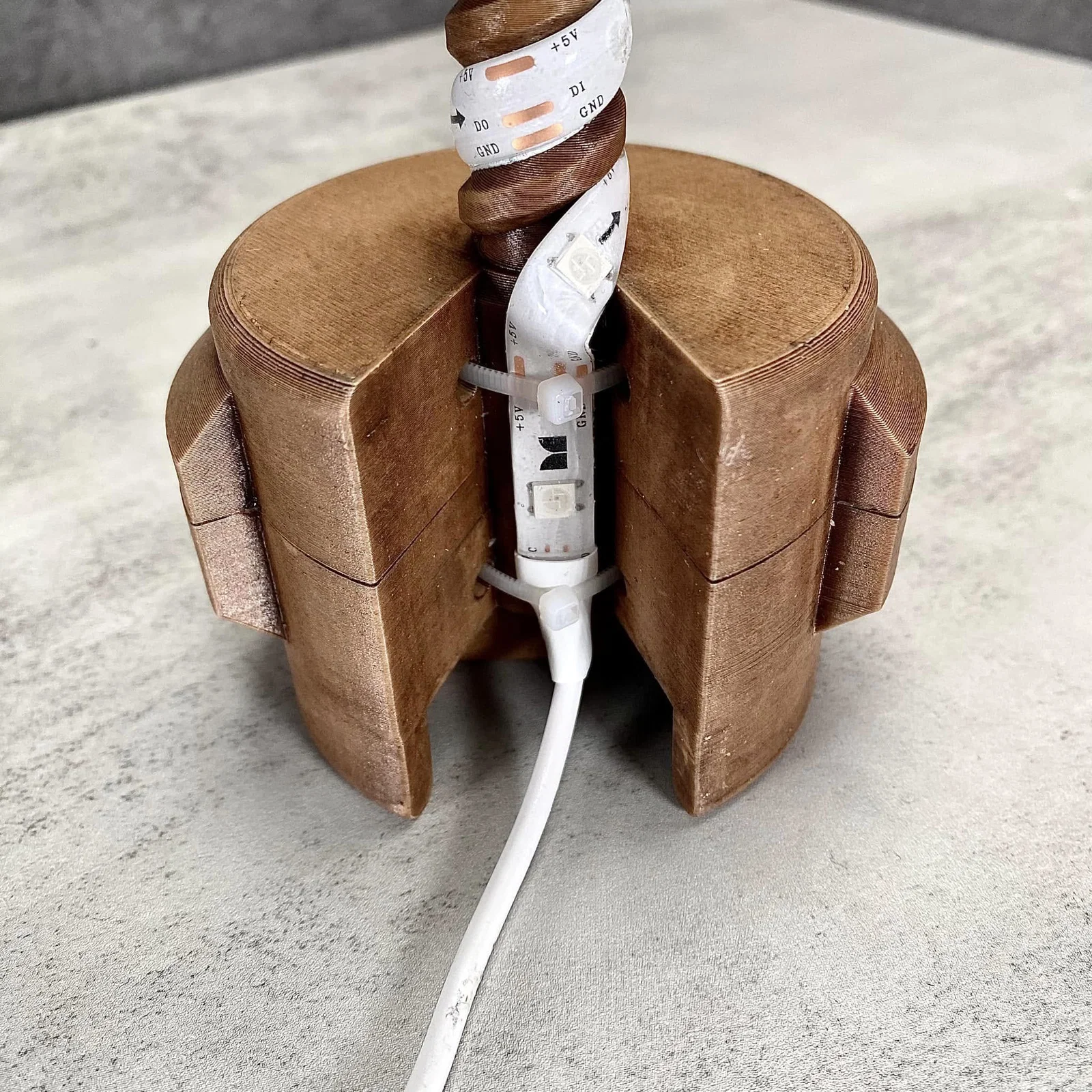 Bạn sẽ cần hai dây rút (zip tie) loại 8 inch để cố định dây LED. Mình đã dùng loại đèn LED dây Monster smart rgb+ic flow 10FT để chiếu sáng. Dây LED này cần được cắt ngắn còn 23.25 inch. Mình thực sự khuyên bạn nên dùng keo siêu dính và kẹp để gắn dây LED vào phần giá đỡ (LED Mount Top). Bạn cần in các linh kiện sau: 1xBottom, 6xColumns, 1xHourglass, 1xLED Mount Bottom, 1xLED Mount Top, 6xLegs và 1xTop. Cả hai phần giá đỡ đèn (LED Mount Top và Bottom) đều cần dùng support khi in. Tất cả các chi tiết đều được in trên máy in Bambu Labs P1S.