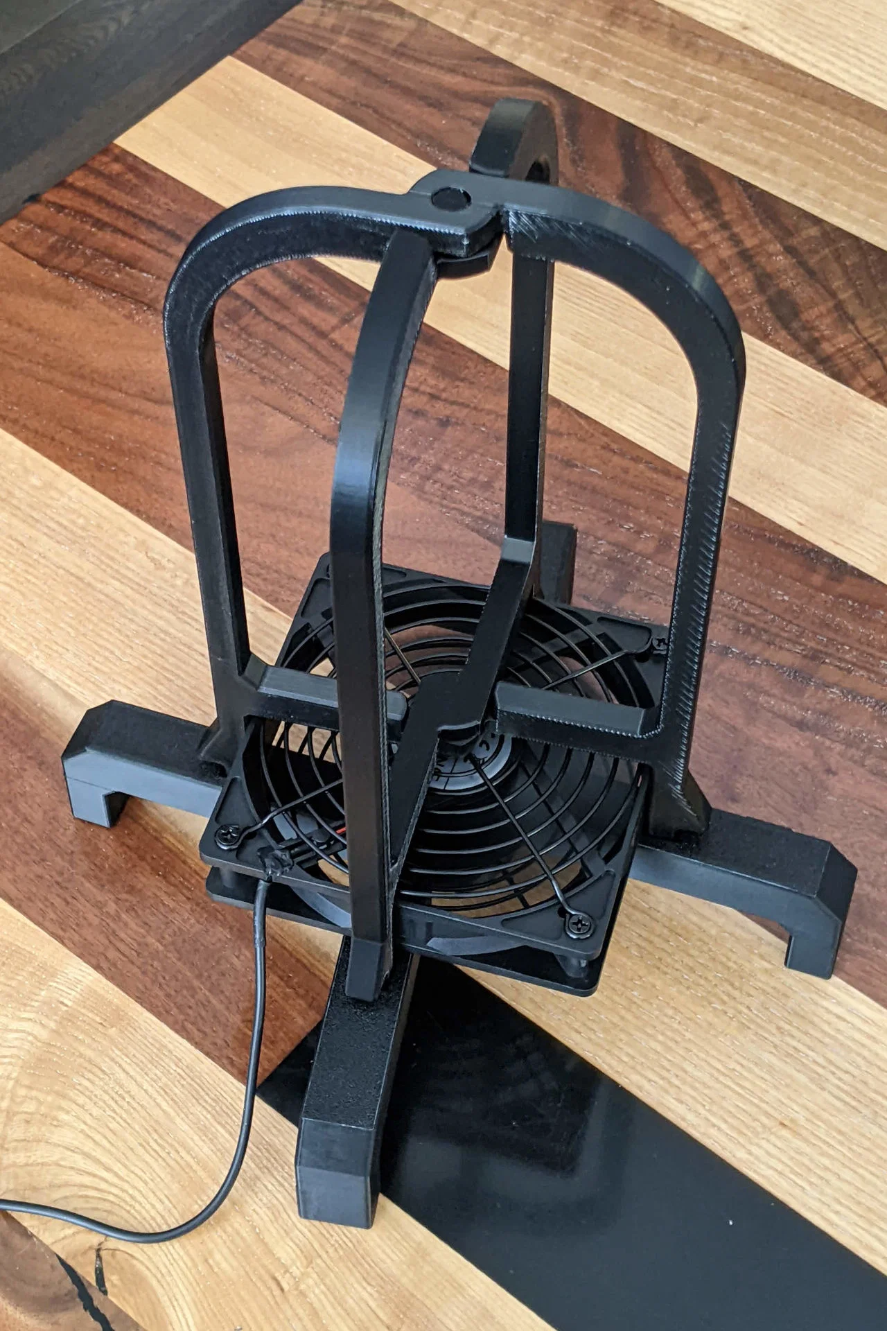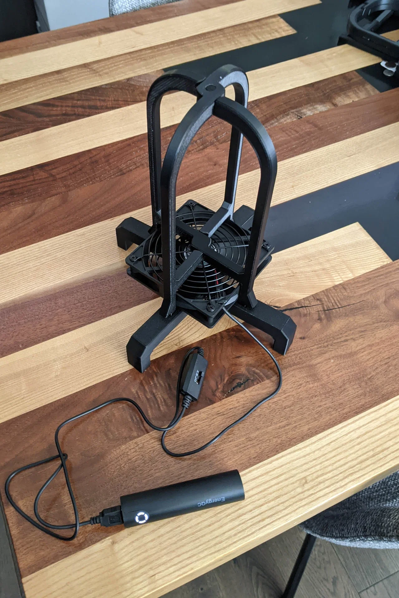 Mình muốn có một chiếc máy sấy đầu fursuit gọn nhẹ hơn để mang theo mỗi khi đi hội chợ (cons). Thế là mình đã thiết kế ra cái giá đỡ đầu gồm hai phần này. Thiết bị sử dụng quạt 120mm tiêu chuẩn và được thiết kế để có thể gấp gọn lại bỏ vào túi khóa kéo (bao gồm cả phần quạt).