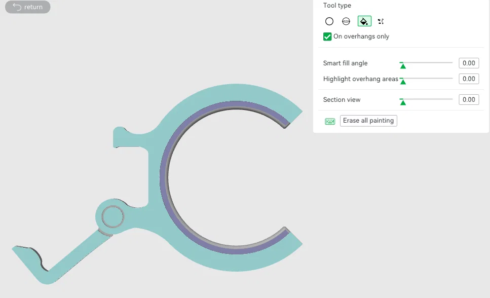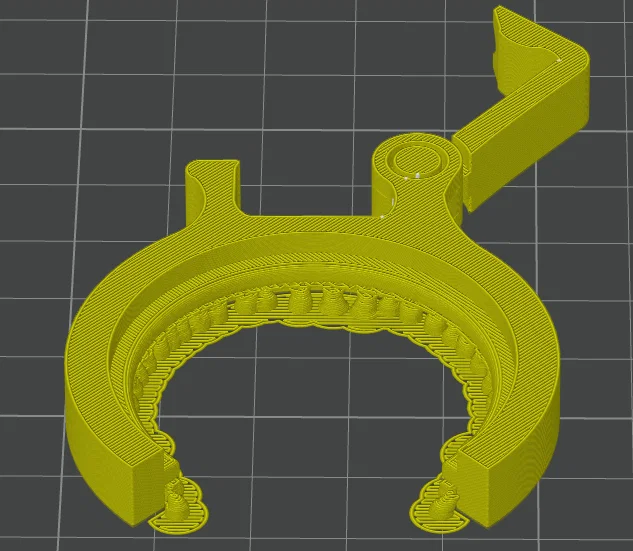 Có, mình dùng “Tree Manual” và tự chọn vùng (paint on support) cho phần mép treo bên trong kẹp. Đừng dùng “Auto” Support vì nó có thể làm hỏng khớp nối print-in-place.