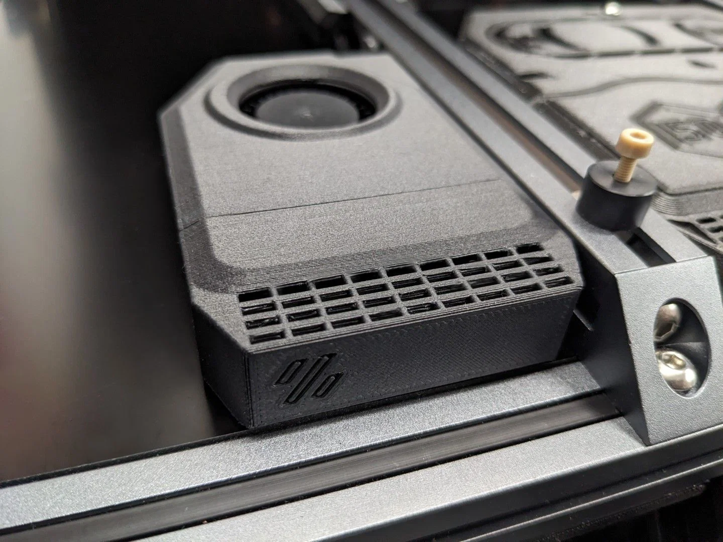 Về cơ bản, đây là phiên bản quạt đơn của Nevermore Micro V6 với phần hộp được sửa đổi chỉ đóng vai trò là ống dẫn khí. Mọi thứ được thiết kế để giữ chiều rộng vỏ máy nhỏ nhất có thể. Nó lắp vừa khít dưới bàn in 300mm (xem ảnh bên dưới), nhưng cũng dùng tốt cho bàn in 250/350mm.