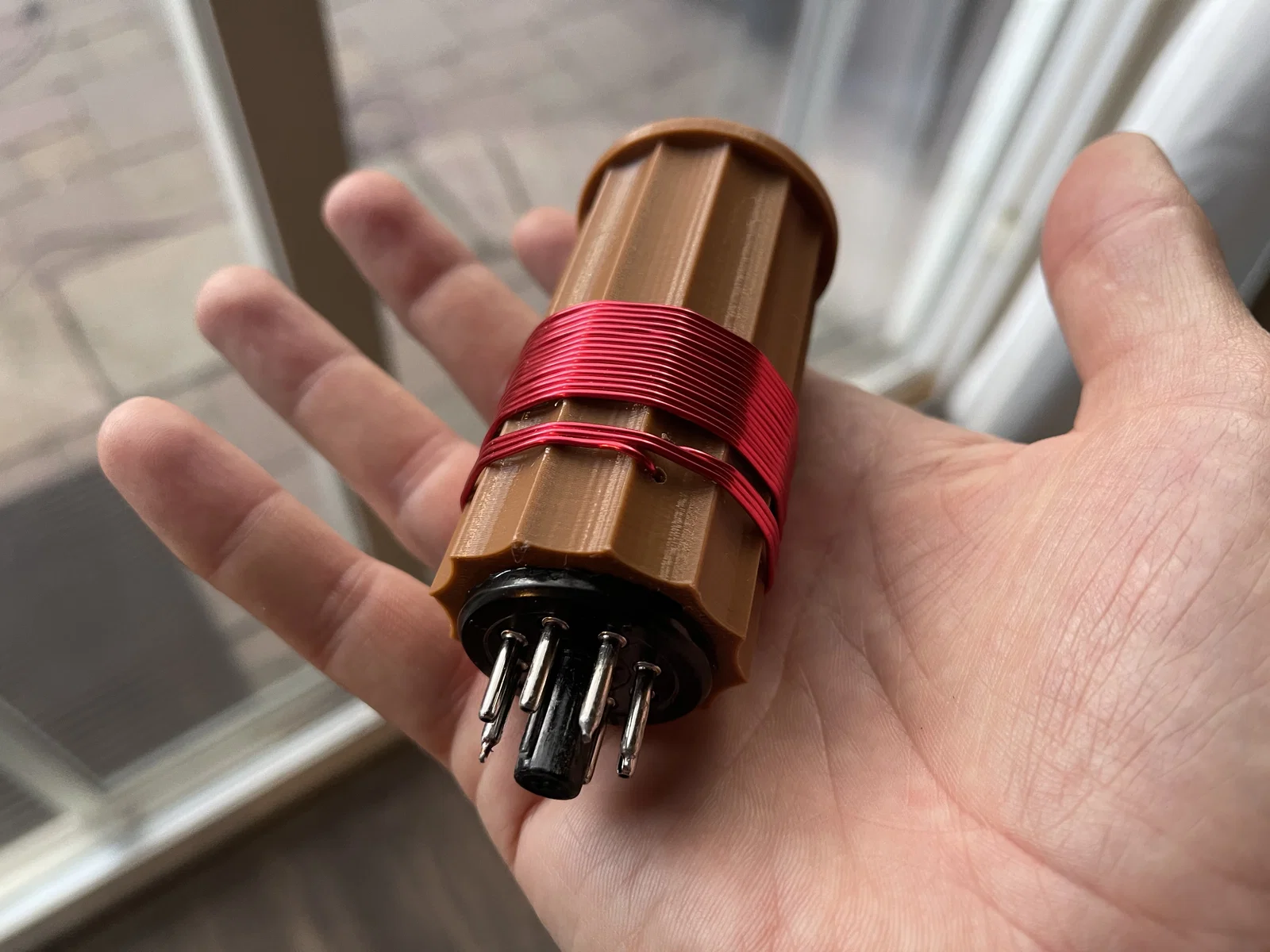 Mẫu thiết kế này được mô phỏng dựa trên kiểu dáng của loại lõi cuộn cảm cổ điển Hammarlund nhưng có vài thay đổi nhỏ. Mình thiết kế nó để lắp vừa với loại đế đèn điện tử 8 chân (octal tube base) thông dụng: