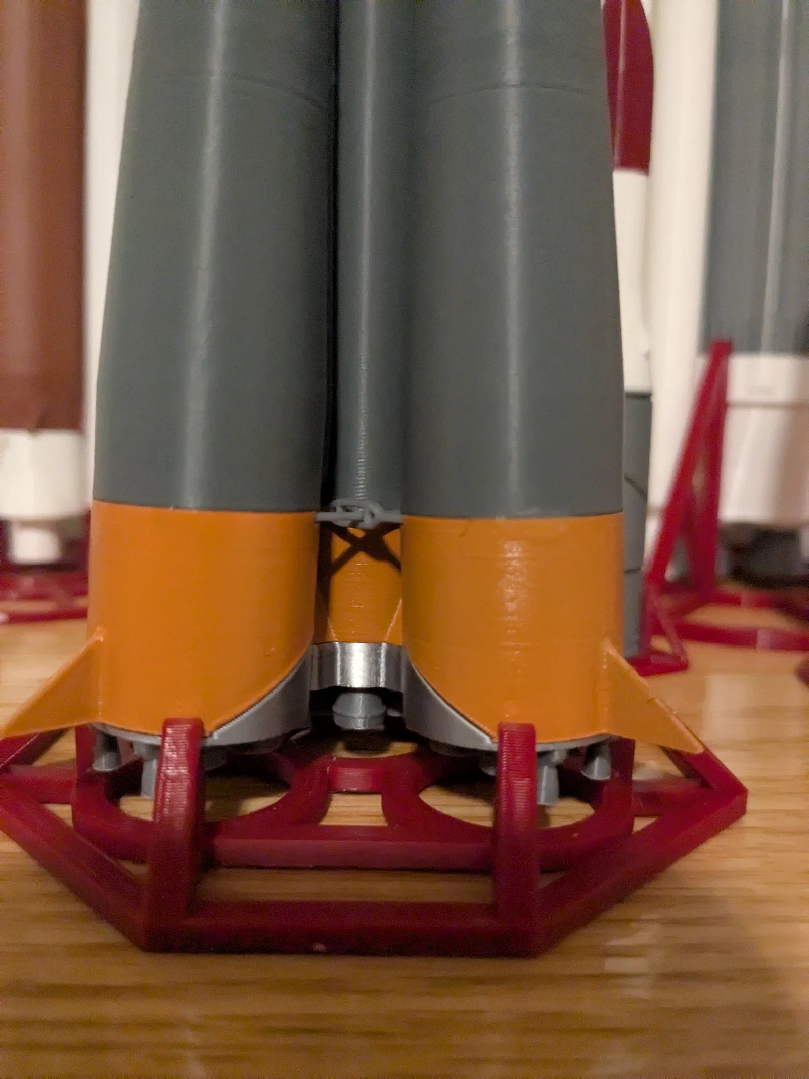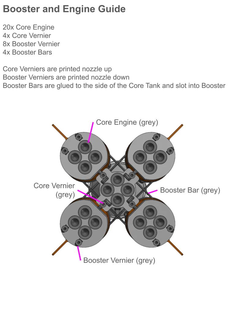 Mô hình này đã được in thành công ở tỷ lệ 1:110. Anh em nên dùng internal brim cho hầu hết các chi tiết hình trụ, và dùng external brim cho phần Side Booster - Lower. Đối với các chi tiết Vernier và Booster Bars, mình khuyến khích dùng layer height mỏng hơn thông thường; mình đã in ở mức .08mm với nozzle .4mm, anh em có thể dùng nozzle nhỏ hơn nếu muốn chi tiết sắc nét hơn.