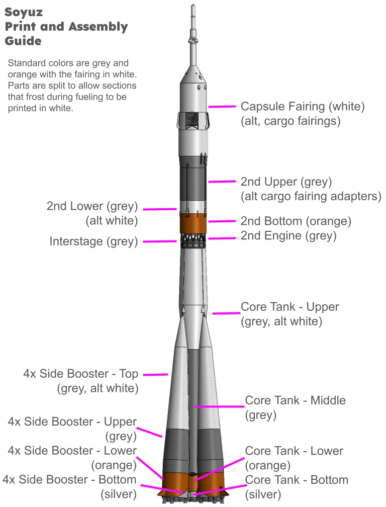 Mô hình tỷ lệ 1:100 của tên lửa đẩy Soyuz từ Nga, đi kèm khoang tàu Soyuz và các phần fairing hàng hóa. Tài liệu bao gồm hướng dẫn in chi tiết cho từng bộ phận để đảm bảo độ chính xác cao nhất cho người chơi.